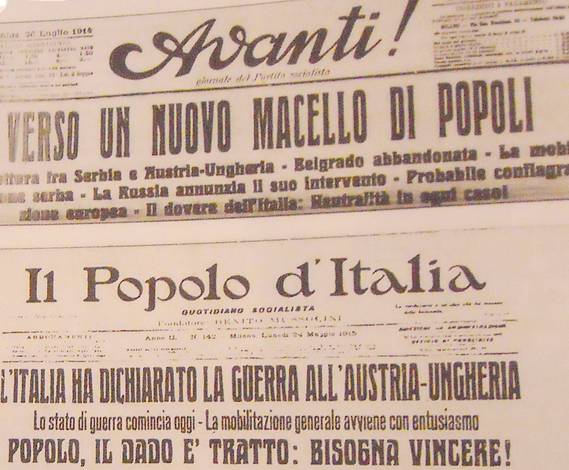 Tutt’altro che favorevoli sono Benedetto XV che, salito al soglio pontificio nel momento in cui scoppia la guerra, dichiara il suo contrasto e assume un atteggiamento fortemente pacifista, e Benito Mussolini, che dalle pagine dell’Avanti conduce una campagna a favore della neutralità assoluta. Ma con una rapida conversione Mussolini si schiera a favore della guerra e nel novembre del 1914, fonda un nuovo quotidiano, “il Popolo d’Italia”, che diviene la principale palestra dell’interventismo di sinistra.