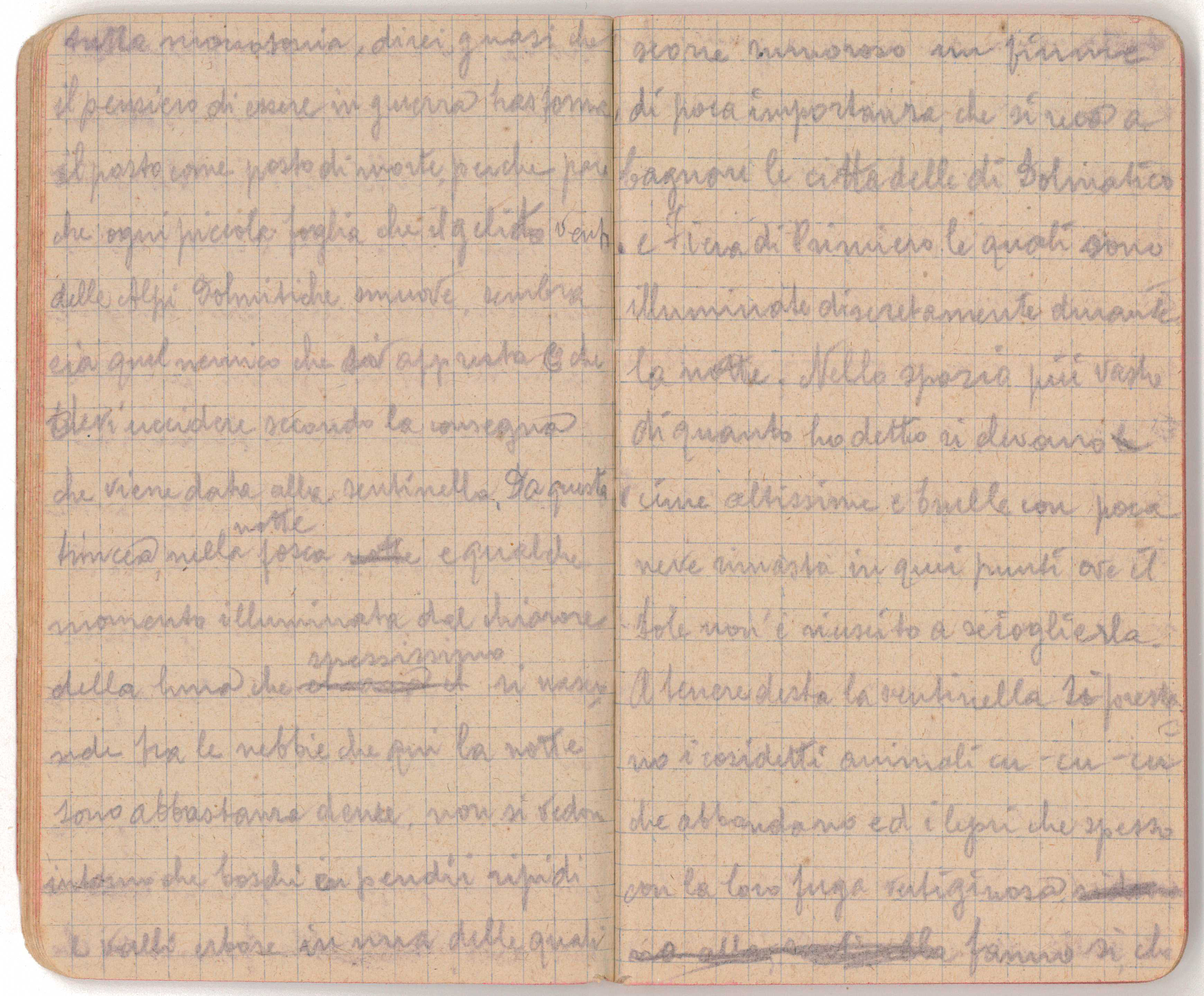 Nella mia trincea sita nella cima di un pendio altissimo tutto boscoso è tutta […], direi quasi che il pensiero di essere in guerra il posto come posto di morte perché pare che ogni piccola foglia che il gelido vento delle Alpi dolomitiche muove, sembra sia quel nemico che si appresta e che devi uccidere secondo la consegna che viene data alla sentinella.