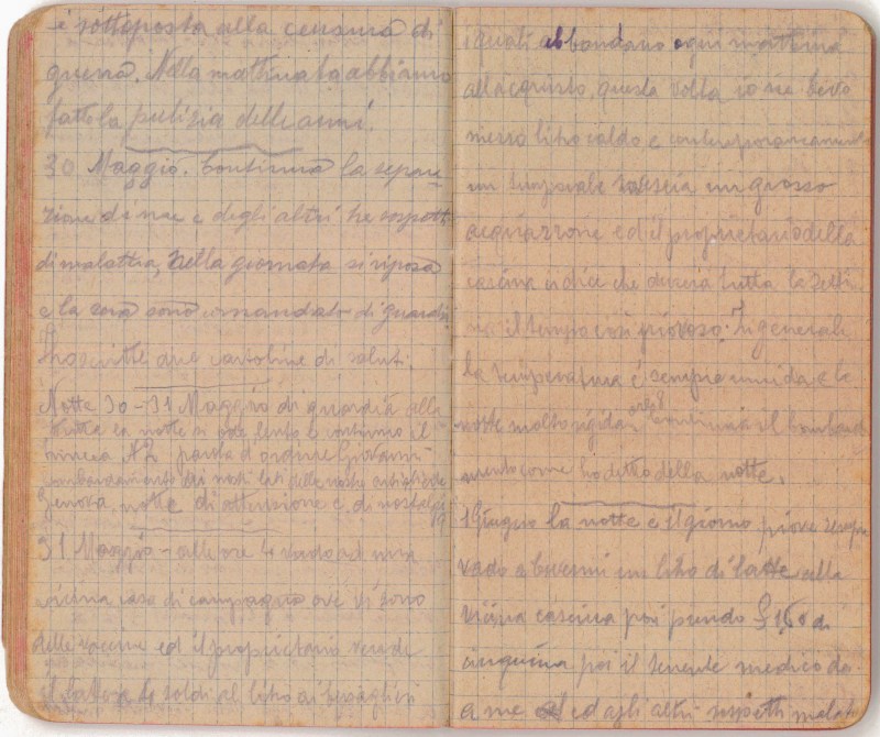 Notte 30-31 maggio di guardia alla Trincea n. 2 parola d’ordine Giovanni tutta la notte si ode, lento, e continuo il bombardamento ai nostri lati delle nostre artiglierie Genova.