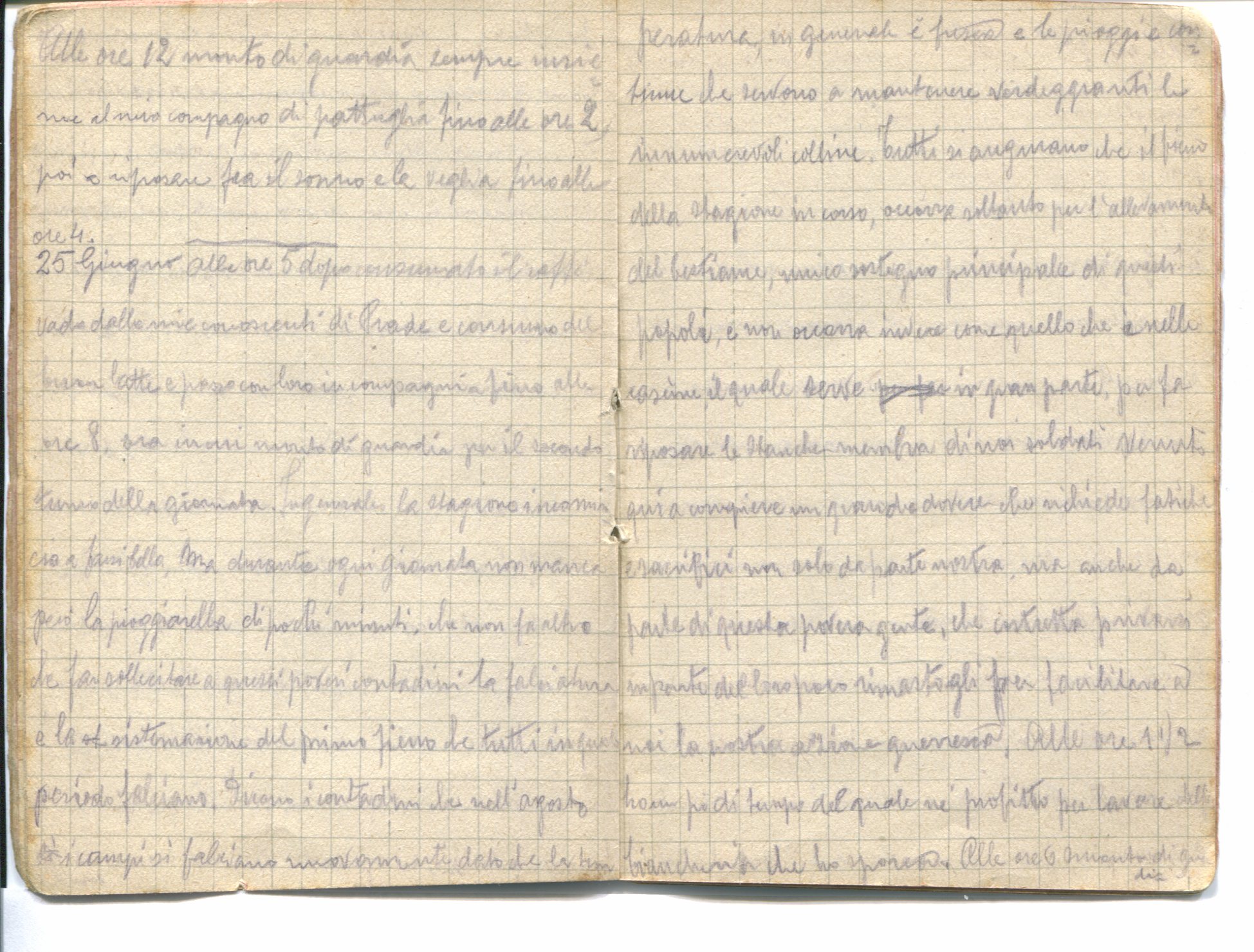 Alle ore 5 dopo consumato il caffè vado dalle mie conoscenti di Prade e consumo del buon latte e pane con loro in compagnia fino alle 8, ora in cui monto di guardia per il secondo turno della giornata. In generale la stagione incomincia a farsi bella, ma durante ogni giornata non manca la pioggerella di pochi minuti, che non fa altro che far sollecitare a questi poveri contadini la falciatura e la sistemazione del primo fieno che tutti in questo periodo falciano. Dicono i contadini che nell’agosto i campi si falciano nuovamente dato che la temperatura in generale è fresca e le piogge continue che servono a mantenere verdeggianti le innumerevoli colline Tutti si augurano che il fieno della stagione in corso, occorra soltanto per l’allevamento del bestiame, unico sostegno principale di questi popoli, e non occorra invece come quello che è nelle cascine, il quale serve in gran parte a far riposare le stanche membra di noi soldati venuti qui a compiere un grande dovere che richiede fatiche e sacrifici non solo da parte nostra, ma anche da parte di questa povera gente che costretta a privarsi in parte del loro poco rimastogli per facilitare a noi la nostra azione guerresca.