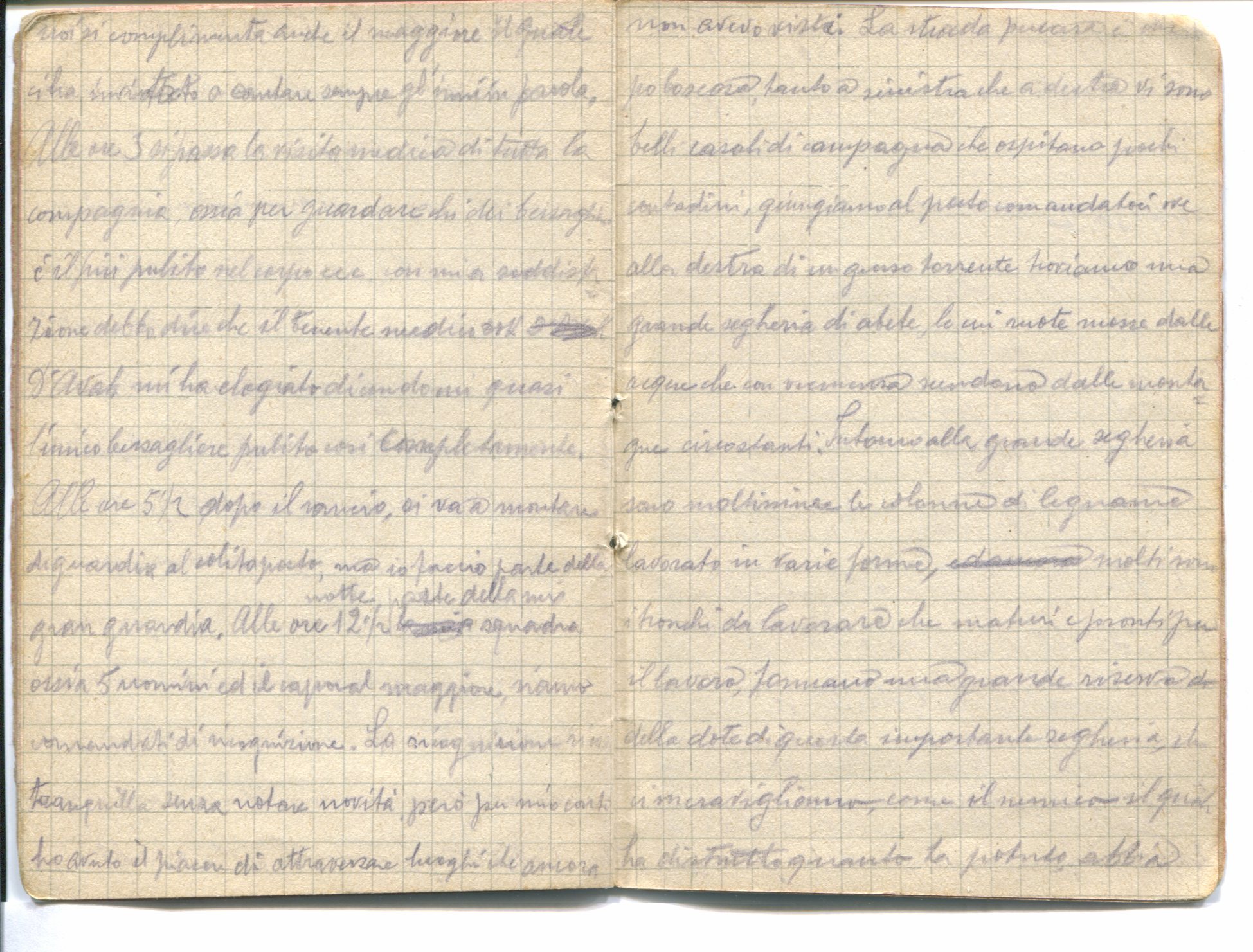 Alle ore 3 si passa la visita medica di tutta la compagnia, ossia guardare chi dei bersaglieri è più pulito nel corpo, ecc. Con mia soddisfazione debbo dire che il tenente medico dott.D’Avoli [?] mi ha elogiato dicendomi quasi l’unico bersagliere pulito così completamente. Alle ore 5.30 dopo il rancio, si va a montare di guardia al solito posto, ma io faccio parte della gran guardia. Alle ore 12.30 di notte, parte della mia squadra, ossia 5 uomini ed il caporale maggiore siamo comandati di ricognizione. La ricognizione va tranquilla senza notare novità, però per mio conto ho avuto il piacere di attraversare luoghi che ancora non avevo visti. La strada percorsa e’ un po’ boscosa, tanto a sinistra che a destra vi sono belli casali di campagna che ospitano pochi contadini, giungiamo al punto comandatoci, ove alla destra di un grosso torrente troviamo una grande segheria di abete le cui ruote mosse dalle acque che con veemenza scendono dalle montagne circostanti. Intorno alla grande segheria sono moltissime le colonne di legname lavorato in varie forme, moltissimi tronchi da lavorare che .. pronti per il lavoro formano una grande riserva, della dote di questa importante segheria ci meravigliamo, come il nemico, il quale ha distrutto quanto ha potuto, abbia lasciato intatto quel legname, alle ore 2.30, dopo la pacifica ricognizione, rientriamo all’attendamento della gran guardia.