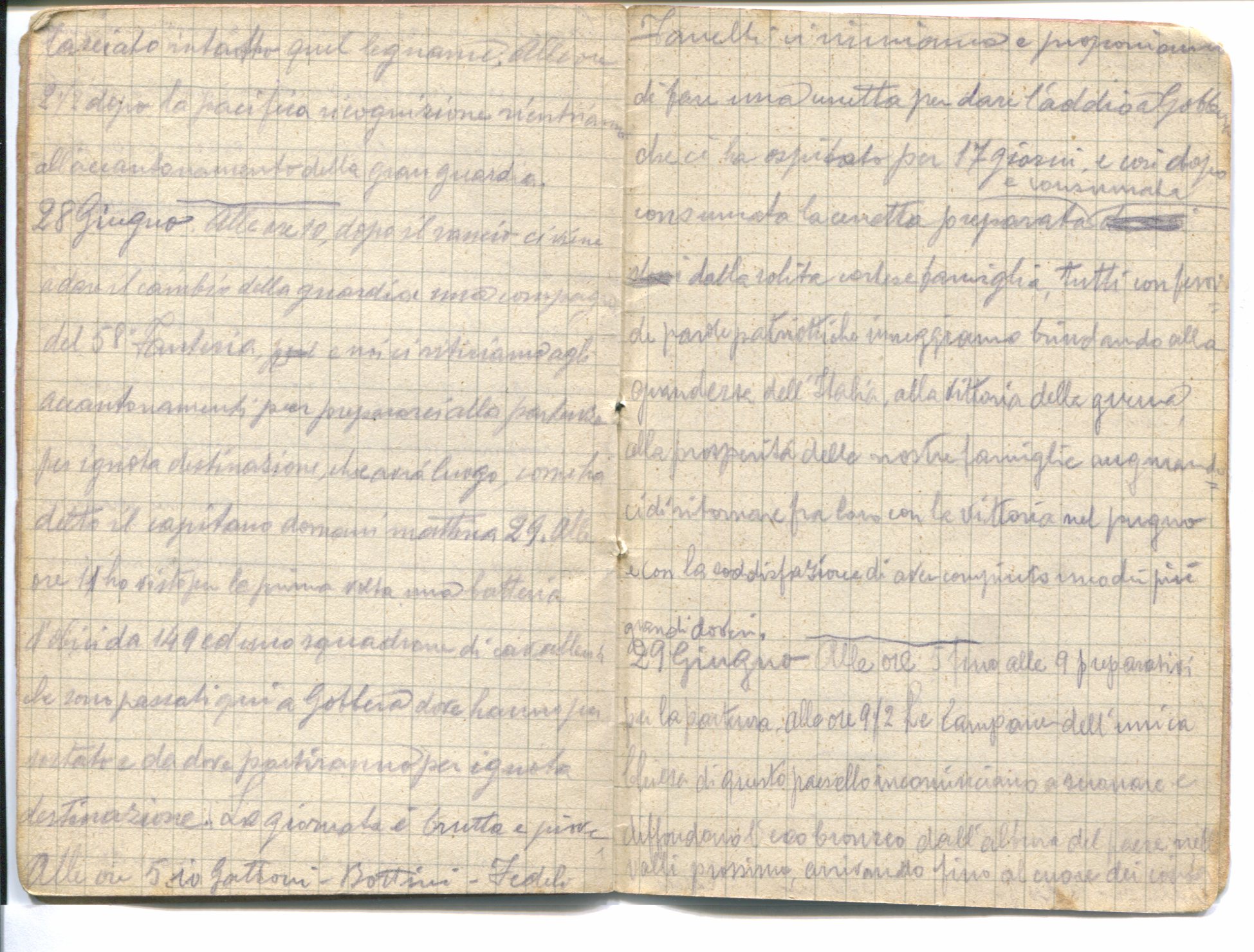 Alle ore 10 dopo il rancio, ci viene a dare il cambio della guardia una compagnia del 58° Fanteria, e noi ci ritiriamo agli attendamenti per prepararsi alla partenza per ignota destinazione, che avrà luogo come ha detto il capitano domani mattina 29. Alle ore 11 ho visto per la prima volta una batteria d’obici da 140 ed uno squadrone di cavalleria che sono passati qui a Gobbera dove hanno pernottato e da dove partiranno per ignota destinazione. La giornata è brutta e piove.Alle ore 5 io, Gattoni [?], Bottini [?] e Fedeli [?] e Fanelli [?] ci riuniamo e proponiamo di fare una cenetta per dare l’addio a Gobbera che ci ha ospitato per 17 giorni e così dopo consumata la cenetta, preparata e consumata dalla solita cortese famiglia, tutti con .. di parole patriottiche inneggiamo brindando alla grandezza dell’Italia, alla vittoria della guerra, alla prosperità delle nostre famiglie augurandoci di ritornare fra loro con la vittoria in pugno e con la soddisfazione di aver compiuto uno dei più grandi doveri.