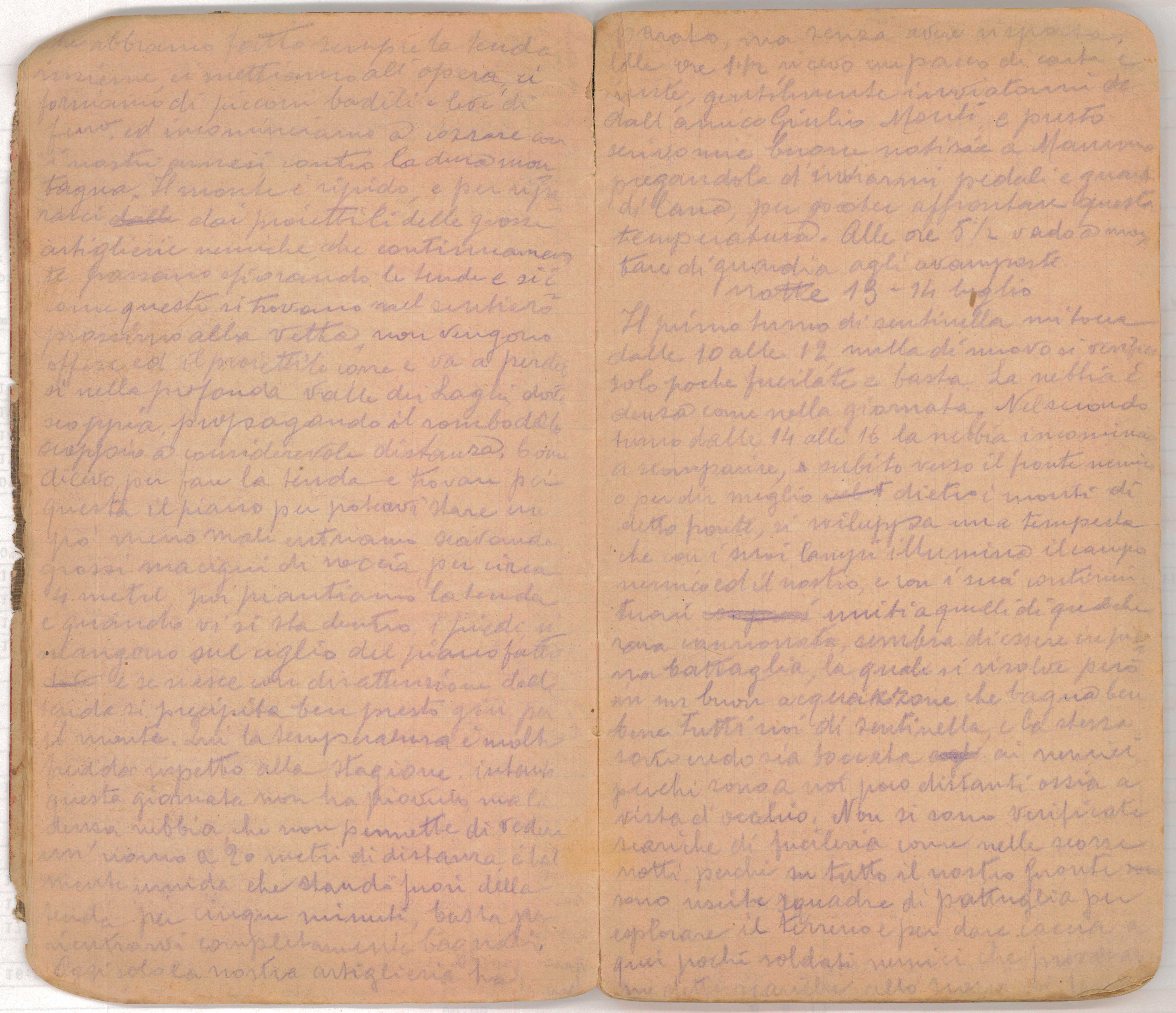 Il primo turno di sentinella mi tocca dalle 10 alle 12, nulla di nuovo si verifica solo poche fucilate e basta. La nebbia è densa come nella giornata. Nel secondo turno dalle 14 alle 16 la nebbia incomincia a scomparire, subito verso il fronte nemico o per dir meglio dietro i monti di detto fronte, si sviluppa una tempesta che con i suoi lampi illumina i campo nemico ed il nostro, e con i suoi continui tuoni uniti a quelli di qualche rara cannonata sembra di essere in piena battaglia, la quale si risolve però con un buon acquazzone che bagna ben bene tutti noi di sentinella, e la stessa sorte credo sia toccata ai nemici perché sono a noi poco distanti ossia a vista d’occhio. Non si sono verificate scariche di fucileria come nelle scorse notti perché su tutto il nostro fronte sono uscite squadre di pattuglia per esplorare il terreno e per dare caccia quei pochi soldati nemici che provano […] dette scariche allo scopo di rispondere al fuoco per scoprire le nostre posizioni e quindi bombardarle. Alle ore 4 incomincia il denso nebbione e qualche colpo di cannone che ci tiene svegli.