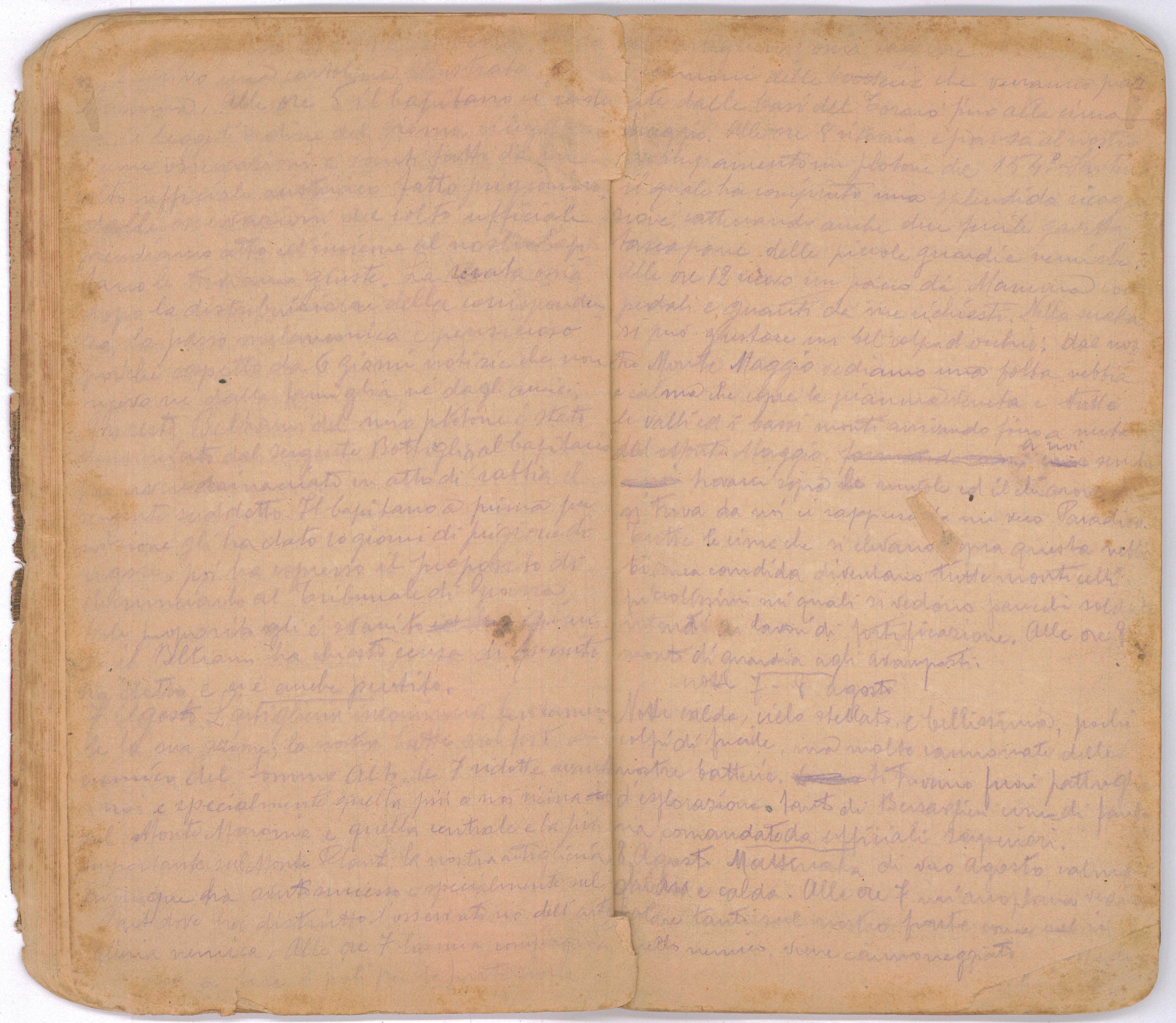 L’artiglieria incomincia lentamente la sua azione, la nostra batte sul forte nemico del Sommo Alto. Le 7 ridotte avanti a noi e specialmente quella più a noi vicina sul Monte Maronia e quella centrale e la più importante sul Monte Planz. La nostra artiglieria ovunque ha avuto successo e specialmente sul Planz dove ha distrutto l’osservatorio dell’artiglieria nemica. Alle ore 7 la mia compagnia … a fare i pali per la protezione dell’artiglieria ossia […] cannoni delle batterie che verranno piazzate dalle basi del Toraro fino alla cima Maggio. Alle ore 8 ritorna e piazza al nostro accampamento un plotone del 154° il quale ha compiuto una splendida ricognizione catturando anche due fucili gavette tascapane delle piccole guardie nemiche. Alle ore 12 ricevo un pacco di Mamma con pedali e guanti da me richiesti. Nella serata si può gustare un bel colpo d’occhio: dal nostro Monte Maggio vediamo una folta nebbia e calma che copre la pianura veneta e tutte le valli ed i bassi monti arrivando fino a metà del Monte Maggio, a noi sembra trovarci sopra le nuvole ed il chiarore si trova da noi ci rappresenta un vero Paradiso. Tutte le cime che si elevano sopra questa nebbia bianca candida diventano tutte monticelli piccolissimi sui quali di vedono parecchi soldati intenti ai lavori di fortificazione. Alle ore 8 monto di guardia agli avamposti.