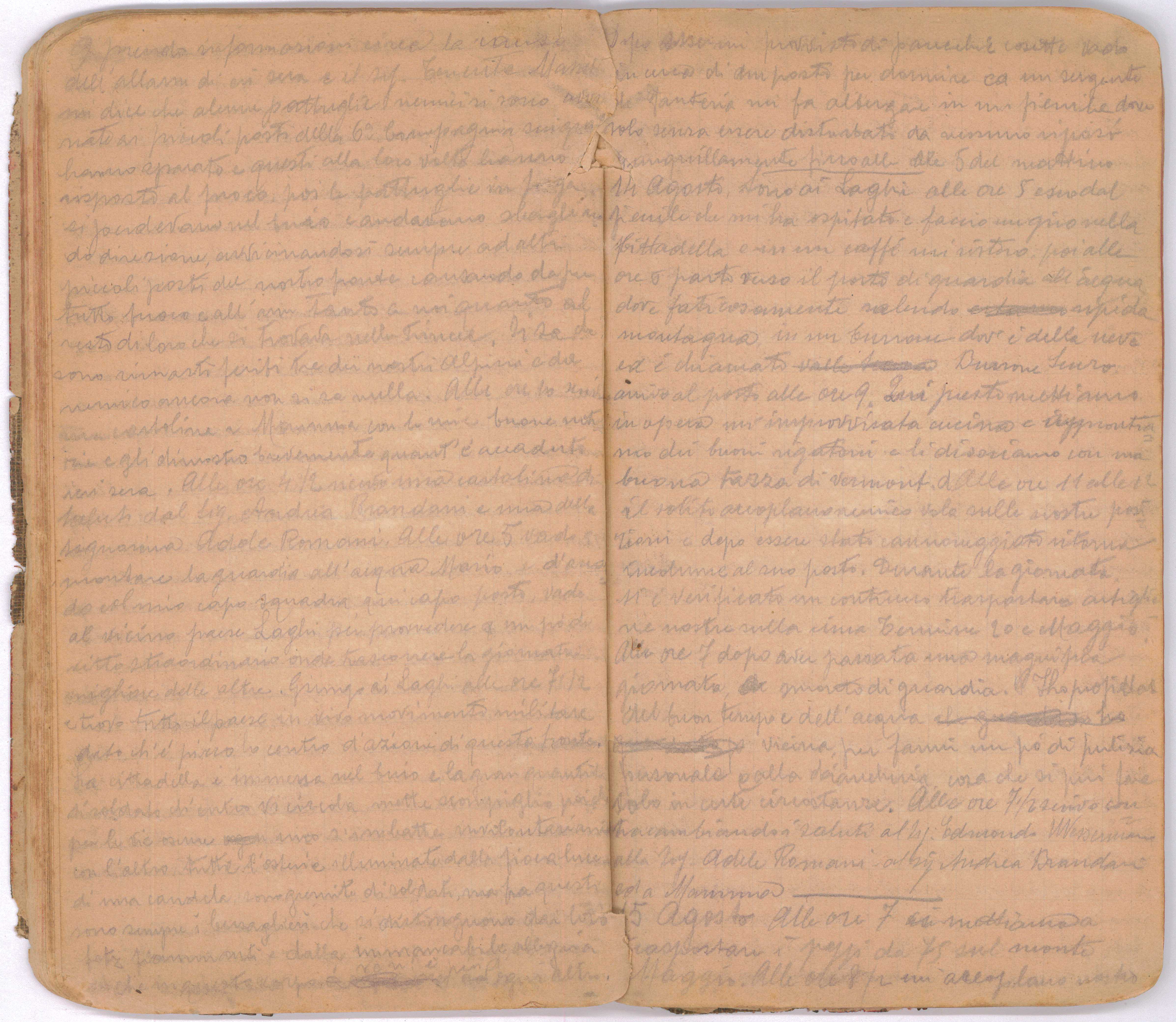 Alle ore 7 ci mettiamo a trasportare i pezzi da 75 sul monte Maggio. Alle ore 8 ½ un aeroplano nostro compie voli audacissimi sulle posizioni nemiche e dopo essere stato fatto a fuoco di fucileria si ritira incolume. Tutta la giornata è vivo il duello delle artiglierie di grosso calibro e sappiamo che ben 2 granate nemiche da 305 tirate sul Monte Molon hanno cagionata la morte di una placida gallina destinata agli ufficiali d’artiglieria i quali senza dubbio hanno affrettato, grazie alla granata da 305, il gustoso pasto. Nulla di danni maggiori dai numerosi proiettili nemici. Alle ore 7 monto di guardia agli avamposti.