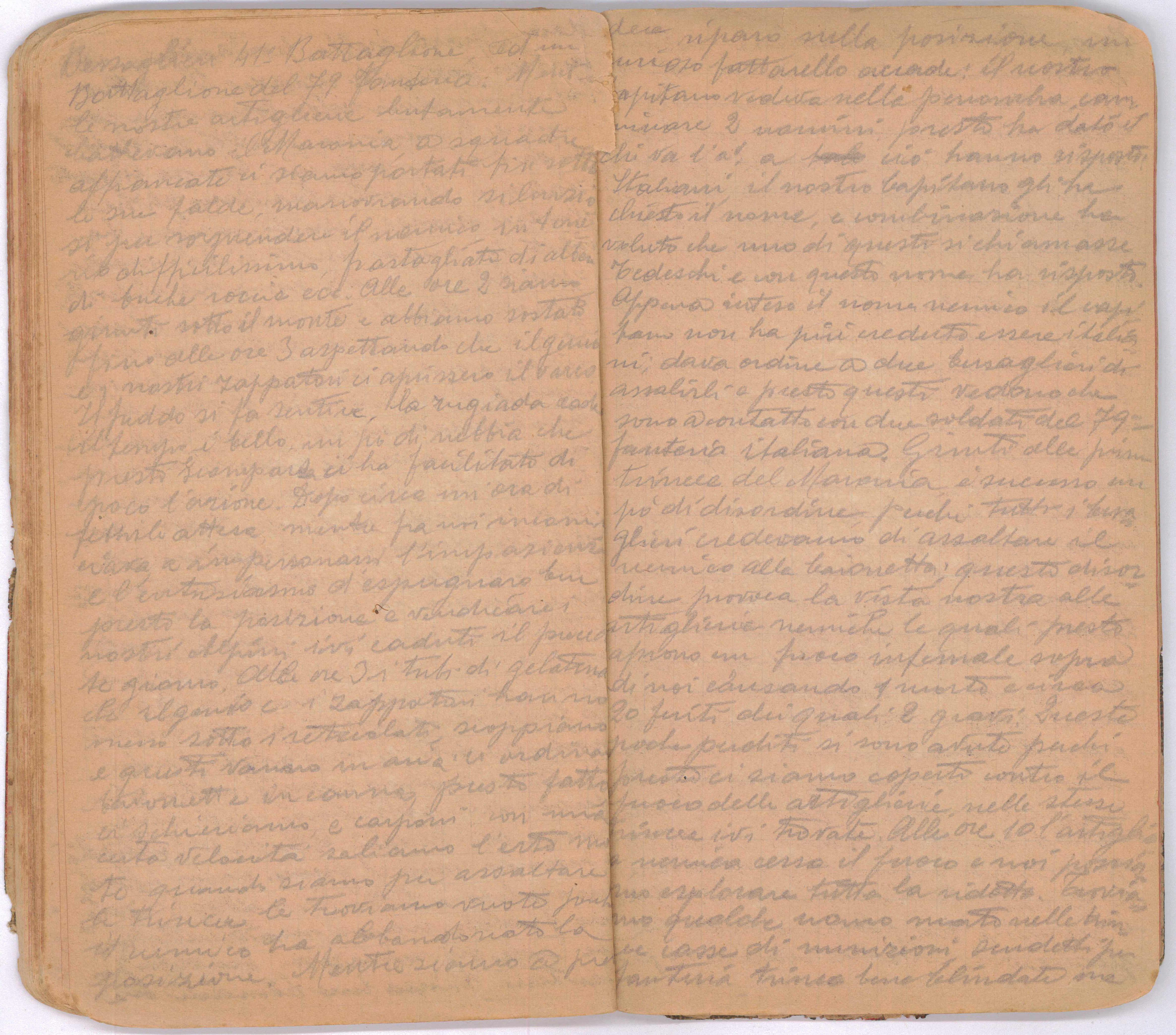 Alle ore 10 ½ ci viene distribuito caffè e carne e vengono dati gli ultimi ritocchi ai preparativi per l’avanzata. Alle ore 11 ci muoviamo verso la cima Maggio, dov’è la 6° Compagnia del nostro Battaglione ci uniamo a questa e alle ore 12 iniziamo la nostra avanzata verso il trinceramento del Monte Maronia. L’avanzata è fatta dalle seguenti forze. 40 uomini del Genio e i Bersaglieri zappatori destinati a far saltare i reticolati, il nostro 4° Battaglione destinato all’occupazione della trincea: muove così la 4° Compagnia opera verso destra la mia 5° al centro e la 6° alla nostra sinistra: riserva 1 compagnia del 4° Reggimento Bersaglieri, 41° Battaglione, ed un Battaglione del 79 Fanteria: mentre le nostre artiglierie lentamente battevano il Maronia, a squadre affiancate ci siamo portati fin sotto le sue falde, manovrando silenziosamente per sorprendere il nemico in terreno difficilissimo, frastagliato di alberi di buche, rocce ecc. Alle ore 2 siamo giunti sotto il monte e abbiamo sostato fino alle ore 3 aspettando che il genio e i nostri zappatori ci aprissero il varco. Il freddo si fa sentire, la rugiada cade, il tempo è bello, un po’ di nebbia che presto è scomparsa ci ha facilitato l’azione. Dopo circa un’ora di febbrile attesa, mentre fra noi incominciava a impersonarsi l’impazienza e l’entusiasmo d’espugnare ben presto la posizione e vendicare i nostri Alpini ivi caduti il precedente giorno. Alle ore 3 i tubi di gelatina che il genio e i zappatori hanno messo sotto il reticolato scoppiano e questi vanno in aria, ci ordinano baionette e in carica, presto fatto, ci schieriamo, e carponi con una certa velocità saliamo l’erto monte quando siamo per assaltare le trincee le troviamo vuote perché il nemico ha abbandonato la posizione. Mentre siamo a prendere riparo sulla posizione, un noioso fattarello accade: il nostro Capitano vedeva nella penombra, camminare due uomini, presto ha dato il chi va la, a ciò hanno risposto italiani, il nostro Capitano gli ha chiesto il nome, e combinazione ha voluto che uno di questi si chiamasse Tedeschi e con questo nome ha risposto. Appena inteso il nome nemico il capitano non ha più creduto essere italiani, dava ordine a due bersaglieri di assalirli e presto questi vedono che sono a contatto con due soldati del 70° fanteria italiano, giunti alle proprie trincee del Maronia, è successo un po’ di disordine, perché tutti i bersaglieri credevano di assaltare il nemico alla baionetta; questo disordine provoca la vista nostra alle artiglierie nemiche le quali presto aprono un fuoco infernale sopra di noi causando 1 morto e circa 20 feriti dei quali 2 gravi: queste poche perdite si sono avute perché presto ci siamo coperti contro il fuoco delle artiglierie, nelle stesse trincee ivi trovate. Alle ore 10 l’artiglieria nemica cessa il fuoco e noi possiamo esplorare tutta la ridotta. Troviamo qualche uomo morto nelle trincee, casse di munizioni, scudetti per fanteria, trincea bene blindata ma in parte distrutta dall’ira della nostra artiglieria. Troviamo ancora fucili e in una grande galleria che dà l’aspetto alla ridotta di un piccolo forte, troviamo tutte le comodità per i soldati in fortezza, 2 […] dormitori, cucina economica forno, latrina e indumenti lasciati dai fuggitivi. Nella galleria che perfetta di tutto, abbiamo a deplorare la poca pulizia. I reticolati che vi sono forti e numerosi e le opere di difesa perfette e potenti, ma abbandonate perché il nemico sapeva di non poter resistere al nostro urto. Indisturbati il resto della giornata, è stato impiegato al ristorarsi, mettersi in posizione di sicurezza e poi riposare sui dormitori che ci ha allestiti il nemico.