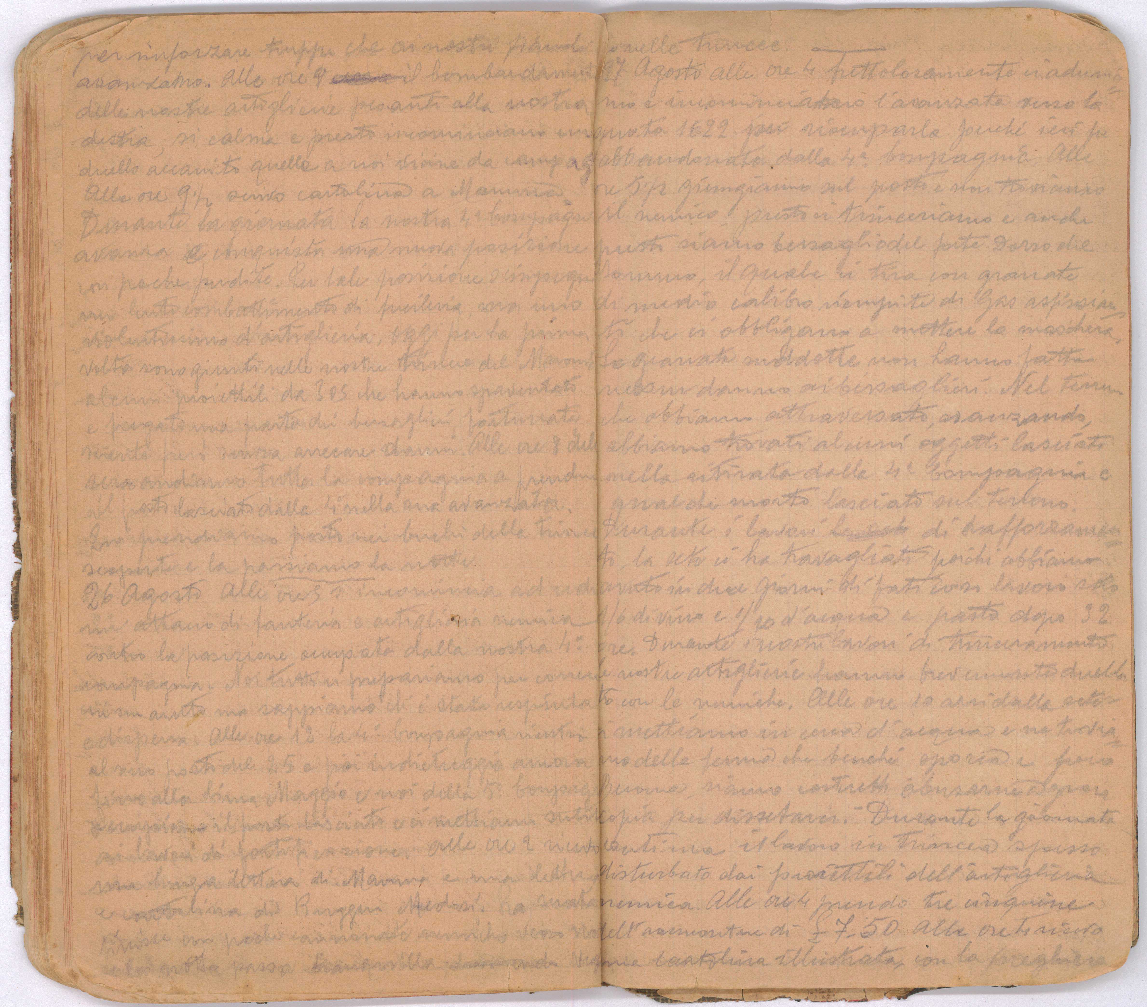 Alle ore 4 ½ appena consumato rancio e caffè ci armiamo e siamo pronti per rinforzare truppe che ai nostri fianchi avanzano. Alle ore 9 il bombardamento delle nostre artiglierie pesanti alla nostra destra, si calma e presto incominciano un duello accanito quelle a noi vicine da campagna. Alle ore 9 ½ scrivo cartolina a Mamma. Durante la giornata la nostra 4° compagnia avanza e conquista una nuova posizione con poche perdite. Per tale posizione s’impegnano lenti combattimenti di fucileria, ma uno violentissimo d’artiglieria, oggi per la prima volta sono giunti nelle nostre trincee del Maronia alcuni proiettili da 305 che hanno spaventato e fugato una parte dei bersaglieri, fortunatamente però senza arrecare danni. Alle ore 8 della sera andiamo tutta la compagnia a prendere il posto lasciato dalla 4° nella zona avanzata. Qui prendiamo posto nei buchi della trincea scoperta e là passiamo la notte.
