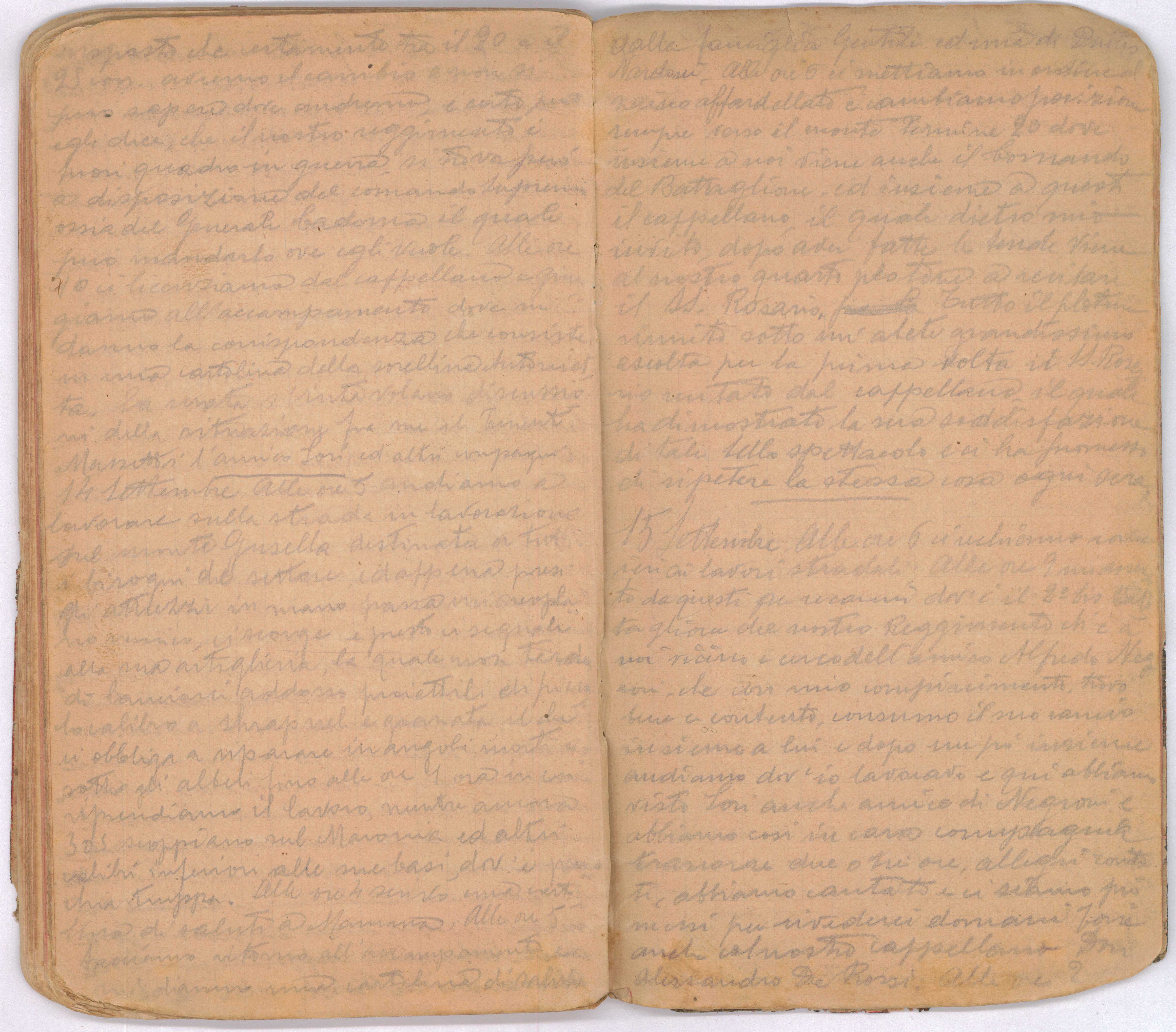 Alle ore 6 ci rechiamo come ieri ai lavori stradali. Alle ore 9 mi assento da questi per recarmi dov’è il 2° bis Battaglione del nostro Reggimento ch’è a noi vicino e cerco dell’amico Alfredo Negroni, che con mio compiacimento trovo bene e contento, consumo il suo rancio insieme a lui e dopo un po’ insieme andiamo dov’io lavoravo e qui abbiamo visto Iori anche amico di Negroni e abbiamo così in cara compagnia trascorse due o tre ore, allegri contenti, abbiamo cantato e ci siamo promessi di rivederci domani forse anche col cappellano Don Alessandro De Rossi. Alle ore 2 riprendo il mio lavoro fino alle 5. Nella serata, scrivo una lettera a Monsig. Franceschini ed una cartolina di risposta alla sua all’amico Duilio Nardoni, poi in moltissimi bersaglieri recitiamo il S. Rosario.