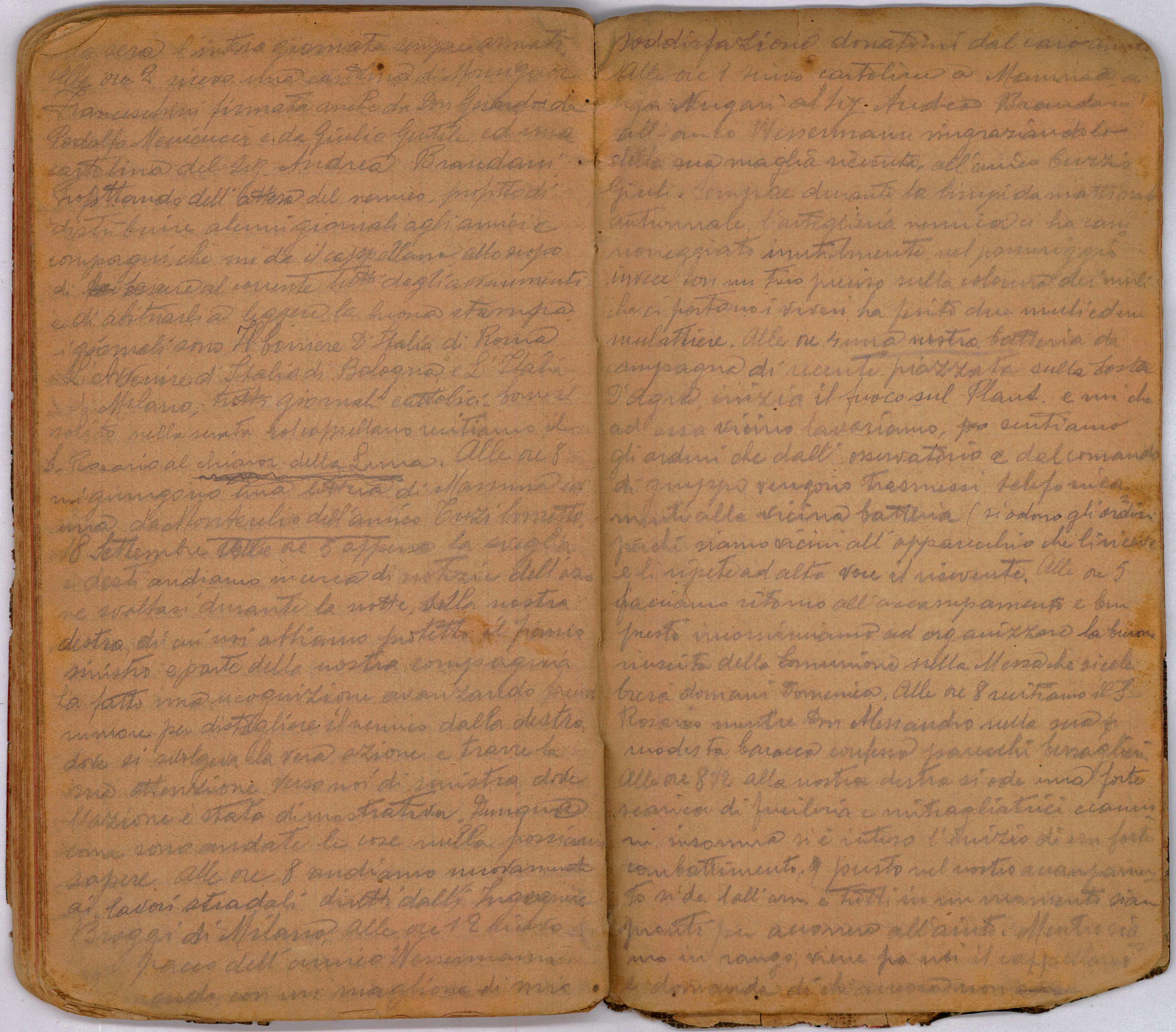 Alle ore 5 appena la sveglia e desti andiamo in cerca di notizie dell’azione svoltasi durante la notte, alla nostra destra, di cui noi abbiamo protetto il fianco sinistro e parte della nostra compagnia ha fatto una ricognizione avanzando facendo rumore per distogliere il nemico dalla destra dove si svolgeva la vera azione e trarre la sua attenzione verso noi di sinistra dove l’azione è stata dimostrativa. Dunque come sono andate le cose nulla possiamo sapere. Alle ore 8 andiamo nuovamente ai lavori stradali diretti dall’Ingegnere Broggi di Milano. Alle ore 12 ricevo un pacco dell’amico Wessermann Edmondo con un maglione di mia soddisfazione donatami dal caro amico. Alle ore 1 scrivo una cartolina a Mamma, a sig. Nugari, al sig. Andrea Brandani, all’amico Wessermann ringraziandolo della sua maglia ricevuta, all’amico Curzio Giuli. Sempre durante la limpida mattinata autunnale, l’artiglieria nemica ci ha cannoneggiato inutilmente nel pomeriggio invece con un tiro preciso sulla colonna dei muli che ci portavano i viveri ha ferito due muli ed un mulattiere. Alle ore 4 una nostra batteria di campagna di recente piazzata sulla Costa D’Agra, inizia il fuoco sul Plaut e noi che ad essa vicino lavoriamo, sentiamo gli ordini che dall’osservatorio e dal comando di gruppo vengono trasmessi telefonicamente alla vicina batteria si odono gli ordini perché siamo vicini all’apparecchio che li riceve e li ripete ad alta voce il ricevente. Alle ore 5 facciamo ritorno all’accampamento e ben presto incominciamo ad organizzare la buona riuscita della comunione nella Messa che si celebrerà domani Domenica. Alle ore 8 recitiamo il S. Rosario mentre Don Alessandro nella sua modesta baracca confessa parecchi bersaglieri. Alle ore 8 ½ alla nostra destra si ode una forte scarica di fucileria e mitragliatrici e cannoni, insomma si è inteso l’inizio di un forte combattimento. Presto nel nostro accampamento si da 1’all’arm e tutti in un momento siam pronti per accorrere all’aiuto. Mentre siamo in rango, viene fra noi il cappellano e domanda di chi non si fosse confessato e prevedendo un momento critico per noi se ci fossimo eventualmente impegnati in combattimento, così raduna intorno a se alcuni di noi incoraggiandoci e ci fa recitare l’atto di contrizione dandoci a sua volta la S. Assoluzione, fra la nostra viva soddisfazione. Alle ore 9 il secondo plotone parte in appostamento per iniziare la protezione del fianco sinistro se l’attacco avesse avuto di ciò bisogno. Durante la notte riposiamo fra il sogno e la veglia armati e pronti agli eventi.