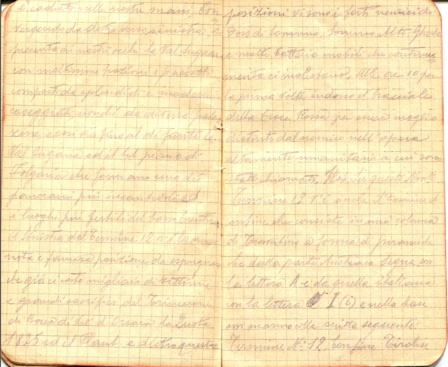 A sinistra del Termine 12 vi è ormai la nota e famosa posizione da espugnare che già ci costa migliaia di vittime e grandi sacrifici del Trincerone di Bocca di Val D’Orsara (ndt Bocca di Val Orsara) , la Quota 1825 ed il Plaut e dietro questa posizione vi sono i forti nemici di Doss del Sommo, Sommo Alto. Queste e molte batterie mobili che continuamente ci molestano. Alle ore 10 per la prima volta indosso il bracciale della Croce Rossa per essere meglio distinto dal nemico nell’opera altamente umanitaria a cui sono stato chiamato. Su questo monte Termine 12 v’e’ anche il termine di confine che consiste in una colonna di travertino a forma di piramide che dalla parte austriaca segna con la lettera A e da quella italiana con la lettera I (i) e nella base in marmo colla scritta seguente : Termine nr. 12 Confine Tirolese e confine comunale di Folgaria 1853. Alle ore 6 incomincia il nemico a cannoneggiare lanciando bombe a mano, gas asfissianti ai bersaglieri del 4° battaglione che sono riparati sotto roccia alle falde del Trincerone dove però sono presi di filata dalle artiglierie nemiche che fanno addirittura strage. Dopo il fuoco noi portaferiti ci portiamo con sollecitudine sul posto a recare soccorso e vediamo con nostro dispiacimento nel vedere le cause del fuoco.