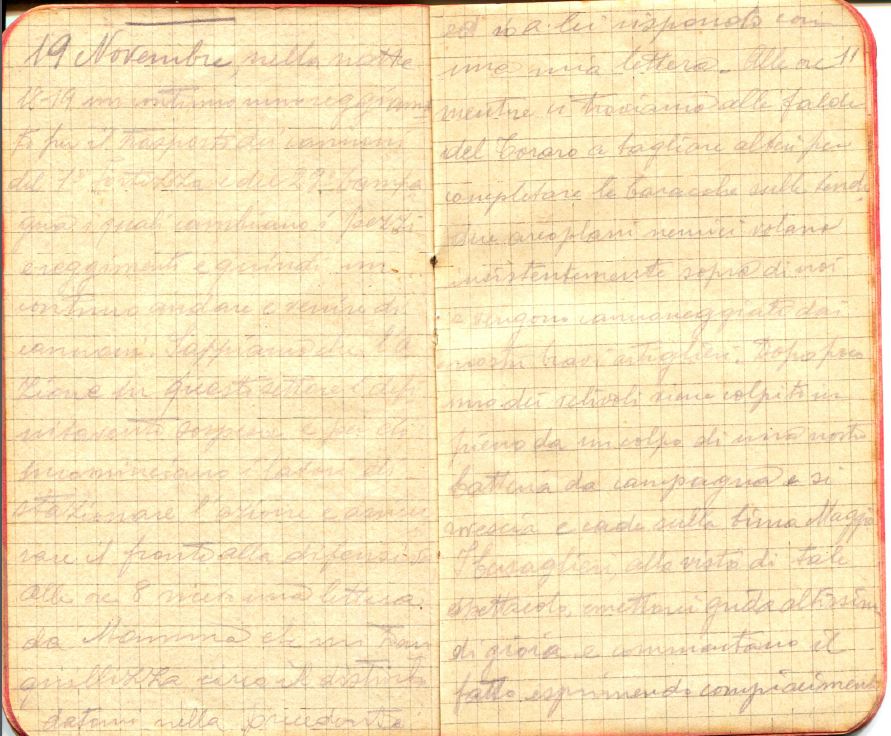 Nella notte 18-19 un continuo rumoreggiamento per il trasporto dei camion del 1° Fortezza e del 29-a Compagnia i quali cambiano pezzi e reggimenti e quindi un continuo andare e venire di camion. Sappiamo che l’azione in questo settore è definitivamente sospesa e per cui incominciano i lavori per stazionare l’azione e per assicurare il fronte alla difensiva. Alle ore 8 ricevo una lettera di Mamma che mi tranquillizza circa il disturbo datomi nella precedente ed io a lei rispondo con una mia lettera. Alle ore 11 mentre ci troviamo alla falde del Toraro a tagliare alberi per completare le baracche sulle tende due aeroplani nemici volano insistentemente sopra di noi e vengono cannoneggiati dai nostri bravi artiglieri. Dopo poco uno dei velivoli viene colpito in pieno da un colpo di una nostra batteria da campagna e si rovescia e cade sulla Cima Maggio. I bersaglieri alla vista di tale spettacolo, emettono grida altissime di gioia e commentano il fatto esprimendo compiacimento per il bravo artigliere che ha puntato sull’apparecchio. Poco dopo io vado insieme al mio tenente D’Avati sul posto dove l’apparecchio è caduto, ma giunti al comando del 41° battaglione bersaglieri non possiamo più proseguire perché zona non nostra, ma del detto battaglione. Intanto posso prendere informazioni su tutto e vedere anche ciò che portavano con sé gli ufficiali che montavano il velivolo. Vengo a sapere che l’apparecchio è stato colpito nel centro da uno shrapnel sparato dalla 7-a batteria della 29-a Compagnia la quale è piazzata sulla Cima Maggio.