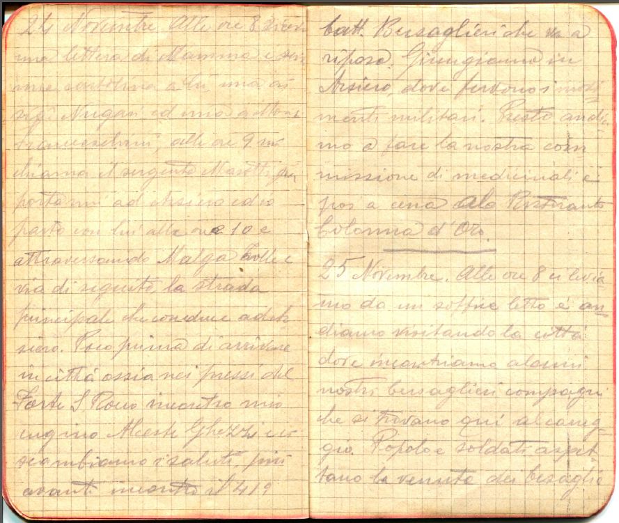 Alle ore 8 ricevo una lettera da Mamma e scrivo una cartolina a lei, una ai sig.ri Nugari e una a Mons. Franceschini. Alle ore 9 mi chiama il sergente Masetti per portarmi ad Arsiero ed io parto con lui alle ore 10 e attraversando Malga Tolle e via di seguito, la strada principale che conduce ad Arsiero. Poco prima di arrivare in città ossia nei pressi di Forte San Rocco incontro mio cugino Alceste Ghezzi e ci scambiamo i saluti. Più avanti incontro il 41° battaglione Bersaglieri che va a riposo. Giungiamo in Arsiero dove fervono i movimenti militari. Presto andiamo a fare la nostra commissione di medicinali e poi a cena al ristorante Colonna d’oro.