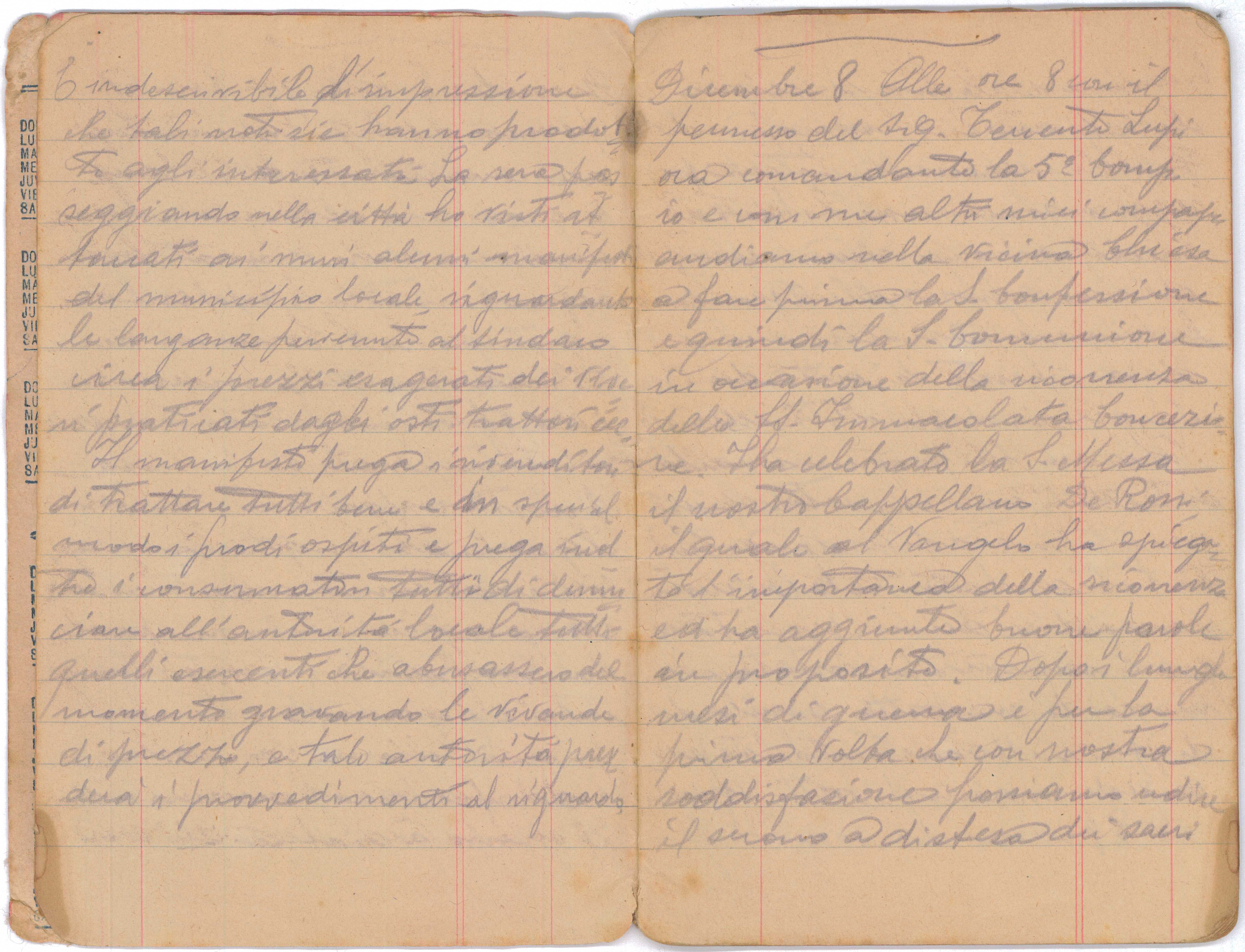 Alle ore 8 con il permesso del sig. Tenente Lupi ora comandante la 5° compagnia e con me altri miei compagni andiamo nella vicina chiesa a fare prima la S. Confessione e quindi la S. Comunione in occasione della ricorrenza della S.S. Immacolata Concezione. Ha celebrato la S. Messa il nostro Cappellano De Rossi il quale al Vangelo ha spiegato l’importanza della ricorrenza ed ha aggiunto buone parole in proposito. Dopo i lunghi mesi di guerra e per la prima volta che con nostra soddisfazione possiamo udire il suono a distesa dei sacri bronzi che danno il segno della grande ricorrenza. I fedeli e specialmente bersaglieri sono molti che si assiepano prima nelle chiese e poi nelle vie. In ogni messa si vede un qual movimento di cittadini che qui non è solito vedersi. Alle ore 10 ricevo una cartolina dell’amico Gentile Giuseppe. Più tardi vado a ritirare la biancheria che la lavandaia mi dice che non è asciutta e mi conferma la constatazione già da me fatta, quella cioè che qui a Marostica il sole non si vede mai e di fatti sono ora 8 giorni che siamo qui e il sole non si è mai visto. Alle ore 4 ricevo una cartolina dell’amico Cesare Curzi ed i saluti della stessa dalla signora Maria Filipponi da Roma.