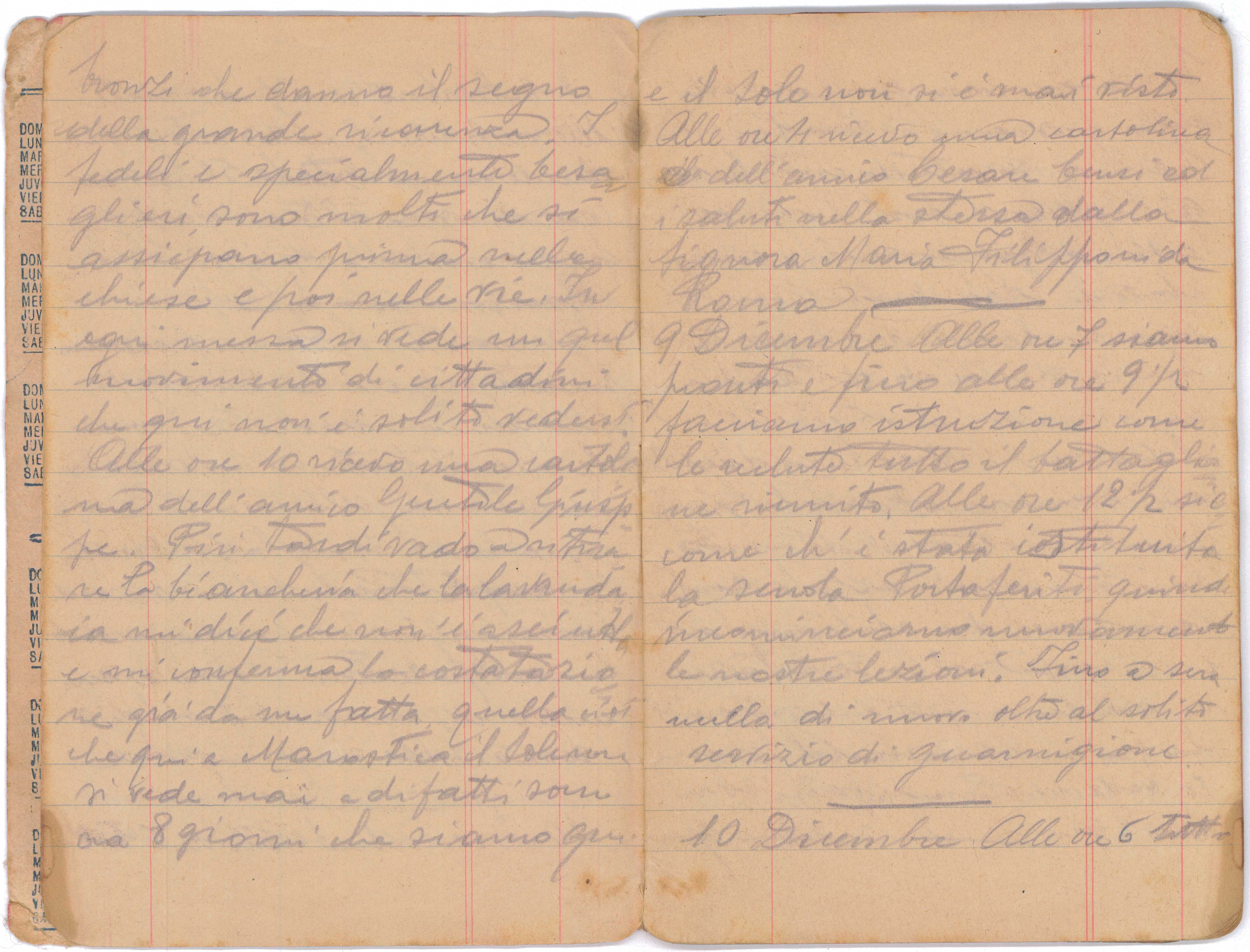 Alle ore 7 siamo pronti e fino alle ore 9 ½ facciamo istruzione come le reclute tutto il battaglione riunito. Alle ore 12 ½ siccome ch’è stata istituita la scuola Portaferiti, quindi incominciamo nuovamente le nostre lezioni, fino a sera nulla di nuovo oltre al solito servizio di guarnigione.