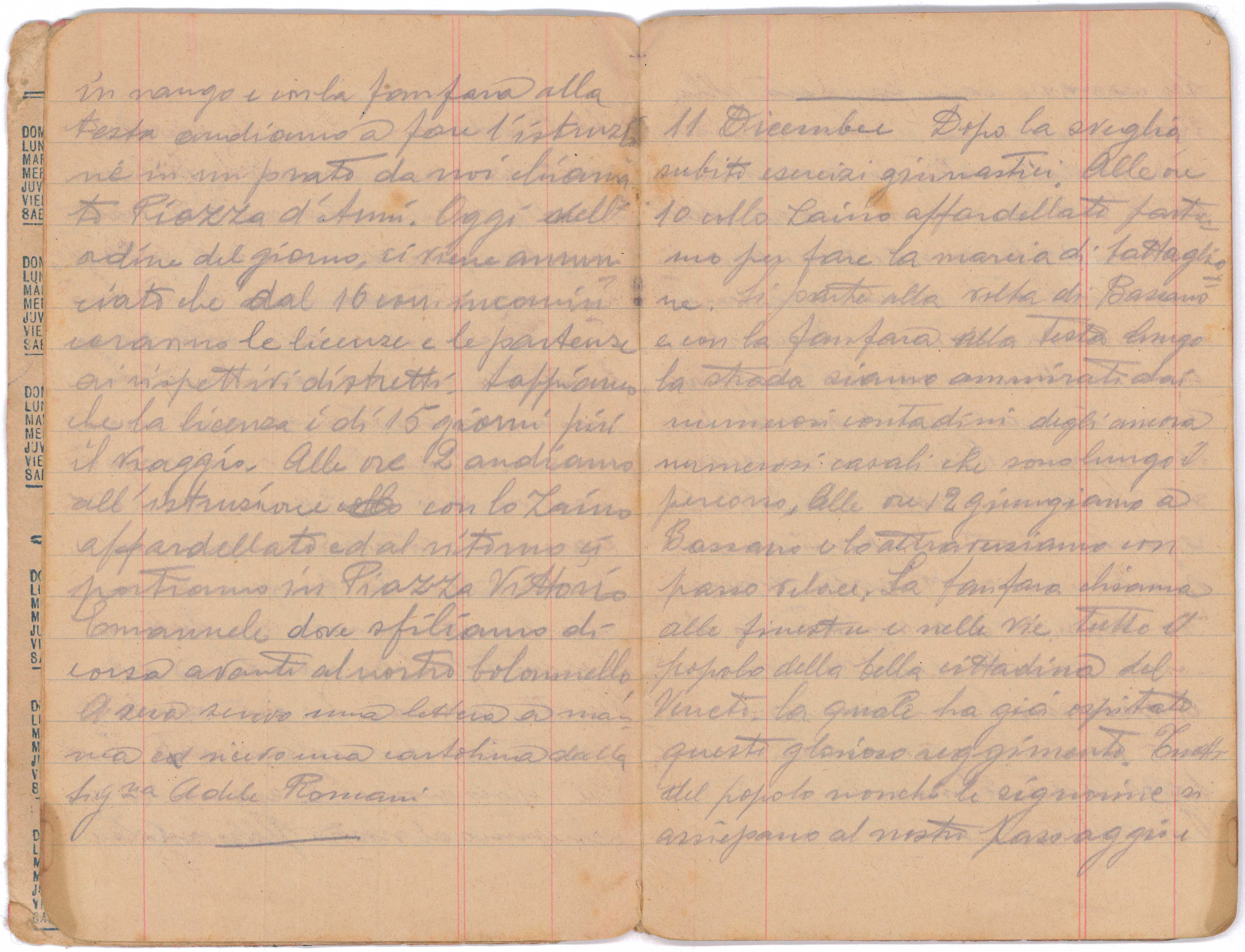 Dopo la sveglia subito esercizi ginnastici. Alle ore 10 collo zaino affardellato partiamo per fare la marci di battaglione. Si parte alla volta di Bassano e con la fanfara alla testa lungo la strada siamo ammirati dai numerosi contadini degli ancora numerosi casali che sono lungo il percorso. Alle ore 12 giungiamo a Bassano e lo attraversiamo con passo veloce. La fanfara chiama alle finestre e nelle vie tutto il popolo della bella cittadina del Veneto, la quale ha già ospitato questo glorioso reggimento. Tutti del popolo nonché le signorine si assiepano al nostro passaggio, scrutano da capo a piedi per riconoscere se vi sono gli amici ed i fidanzati improvvisati nello scorso aprile ossia quando qui sostò il reggimento. L’accoglienza entusiastica, ma negli interessati sopra detti molta delusione, poiché tanti anzi la maggior parte dei primi bersaglieri si sono sacrificati per la grandezza della Patria, e quindi sono scomparsi da queste file che sono formate ormai dai pochi risparmiati da Dio e dai complementi sempre venuti. Lasciamo Bassano e ci dirigiamo verso Solagna ma stante l’ora tarda in un certo punto a 15 km dalla partenza ossia da Marostica facciamo alt per 10 minuti e poi di nuovo dietro front. Rientriamo a Bassano e lo attraversiamo più svelti di prima sempre ammirati e ci vengono fatti i migliori auguri per i prossimi cimenti ai quali saremo chiamati, così facendo la stessa strada di prima rientriamo a Marostica alle ore 4 dopo aver fatto su e giù per 30 km.
