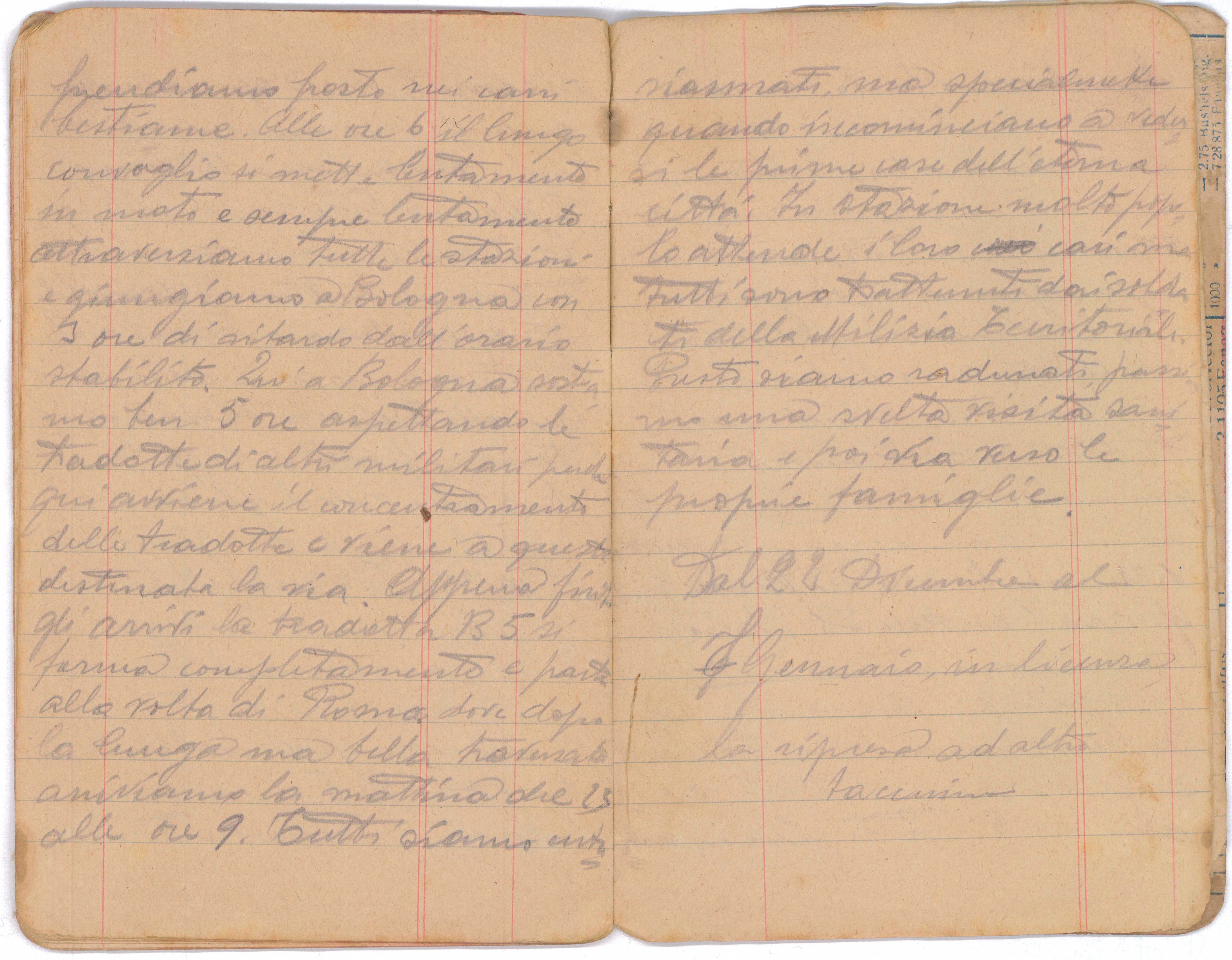 Tutti alla corsa meno i partenti che siamo 35 quali ci prepariamo lo zaino e le armi e facciamo il versamento di tutto ciò. Alle ore 9 andiamo al comando del 4° battaglione per la visita medica e poi dobbiamo ritornare alle ore 11 per la partenza definitiva. Alle ore 12 siamo tutti i partenti radunati nella piazza principale di qui sotto lo sguardo d’ammirazione di molto popolo. Alle ore 1 ci danno la posta ed ho una cartolina di zio Edoardo. Alle ore 1 ½ con la fanfara alla testa, con gli auguri dei signori ufficiali e del popolo partiamo alla volta di Thiene dove dopo 18 km di percorso giungiamo alle ore 3 ½ in questa città passiamo veloci come a Breganze e tutti ci ammirano. Sono in questa stazione molti militari di vari corpi quelli cioè che la tradotta B5 che arriva fino a Roma. Entriamo in treno e prendiamo posto nei carri bestiame, alle ore 6 il lungo convoglio si mette lentamente in moto e sempre lentamente attraversiamo tutte le stazioni e giungiamo a Bologna con 3 ore di ritardo dall’orario stabilito. Qui a Bologna sostiamo ben 5 ore aspettando le tradotte di altri militati perché qui avviene il concentramento delle tradotte e viene a queste destinata la via. Appena finiscono gli arrivi la tradotta B5 si ferma completamente e parte alla volta di Roma dove dopo la lunga ma bella traversata arriviamo la mattina del 23 alle ore 9. Tutti siamo entusiasmati, ma specialmente quando incominciano a vedersi le prime case dell’eterna città. In stazione molto popolo attende i loro cari ma tutti sono trattenuti dai soldati della milizia territoriale. Presto siamo radunati, passiamo una svelta visita sanitaria e poi via verso le proprie famiglie.