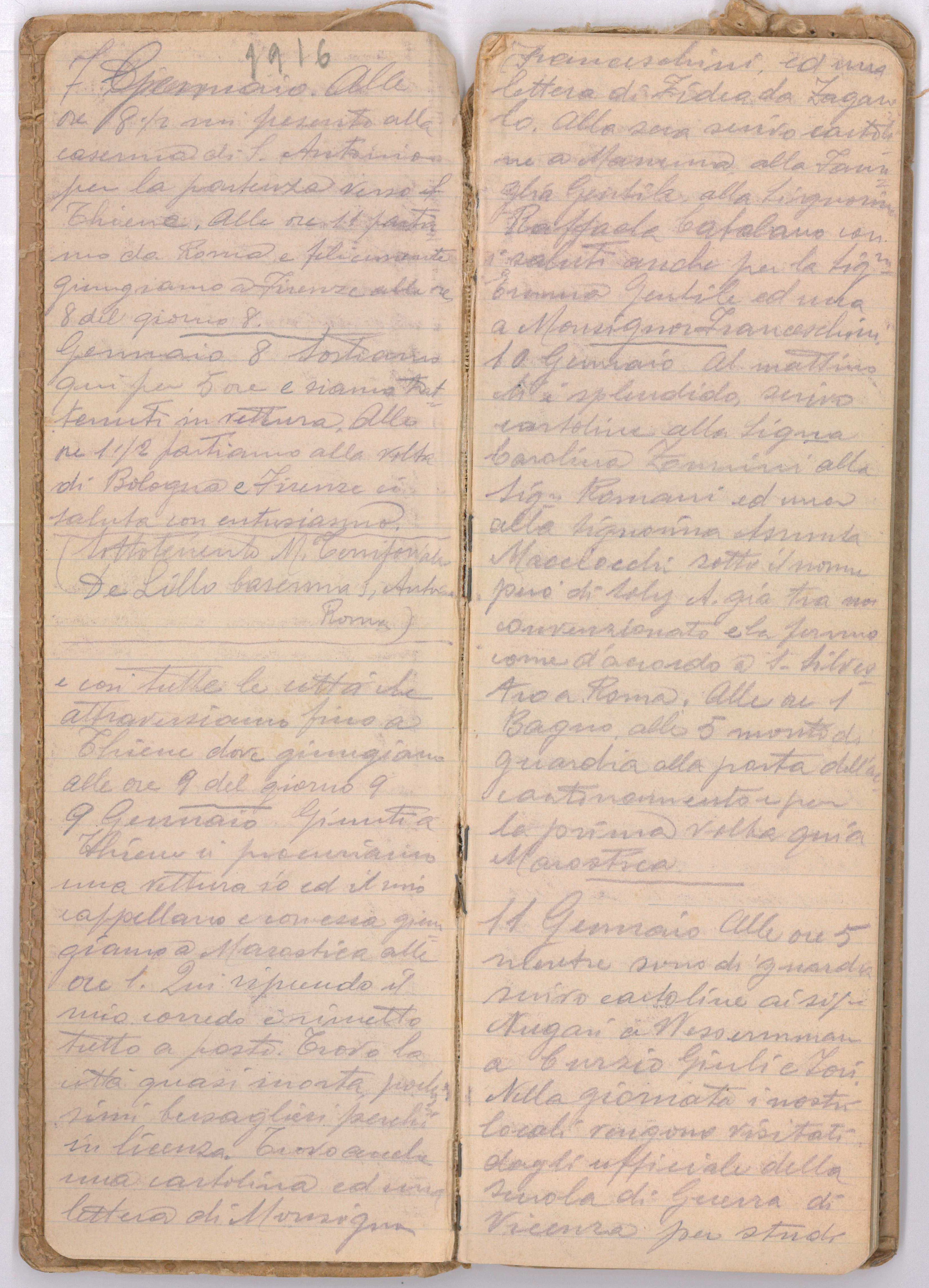 Alle ore 8 ½ mi presento alla caserma di S. Antonio per la partenza verso Thiene. Alle ore 11 partiamo da Roma e felicemente giungiamo a Firenze alle ore 8 del giorno 8.