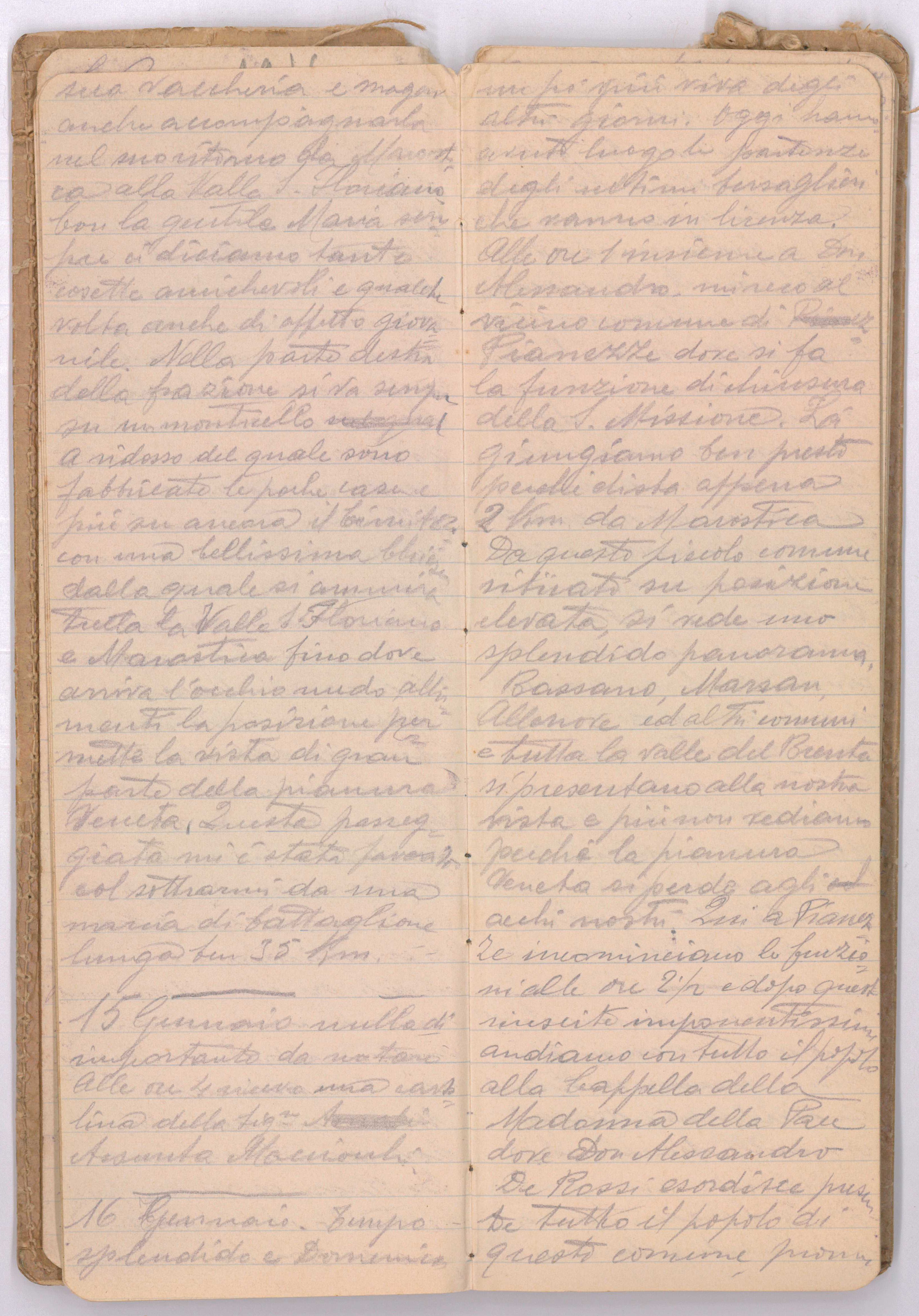 Tempo splendido e Domenica un po’ più viva degli altri giorni. Oggi hanno avuto luogo le partenze degli ultimi bersaglieri che vanno in licenza. Alle ore 1 insieme a Don Alessandro mi reco al vicino comune di Pianezze dove si fa la funzione di chiusura della S. Missione. Lì giungiamo ben presto perché dista appena 2 km da Marostica. Da questo piccolo comune ritirato su posizione elevata, si vede uno splendido panorama, Bassano, Marsan, Allenove [ndt: a le Nove] ed altri comuni e tutta la valle del Brenta si presentano alla nostra vista e più non vediamo perché la pianura veneta si perde agli occhi nostri. Qui a Pianezza incominciamo le funzioni alle ore 2 ½ e dopo queste riuscite imponentissimi andiamo con tutto il popolo alla Cappella della Madonna della Pace dove Don Alessandro De Rossi esordisce presente tutto il popolo di questo comune, pronunciando un discorso pieno di fede, raccomandando a tutti la fervida preghiera per la Pace. Dopo la cerimonia all’aperto, andiamo a casa del Parroco locale dove prendiamo qualche bevanda e poi partiamo insieme anche a Don Armando Capp. Del 17° batt. Alla volta di Marostica dove giungiamo alle ore 5 ½. Questa sera sono invitato dalla cortesissima e cristiana famiglia Serafini fabbricanti di cappelli di paglia di questa città a giocare a tombola in casa loro e così con essi sto fino alle ore 10 ½ allegramente. Altre volte avevo già constatato il fatto che sto per dire, ma questa sera in mia presenza ho avuta la prova. Le donne quasi tutte fumano tanto sigari come sigarette e molte fumano con pipe di grossa portata e ciò lo fanno non per le strade ma nelle rispettive case dove il detto vizio quasi impera. Sono invitato anche per domani sera al giuoco della Tombola. Alla sera ricevo una lettera di Giulio Monti ed una cartolina della Sig.na Carolina.