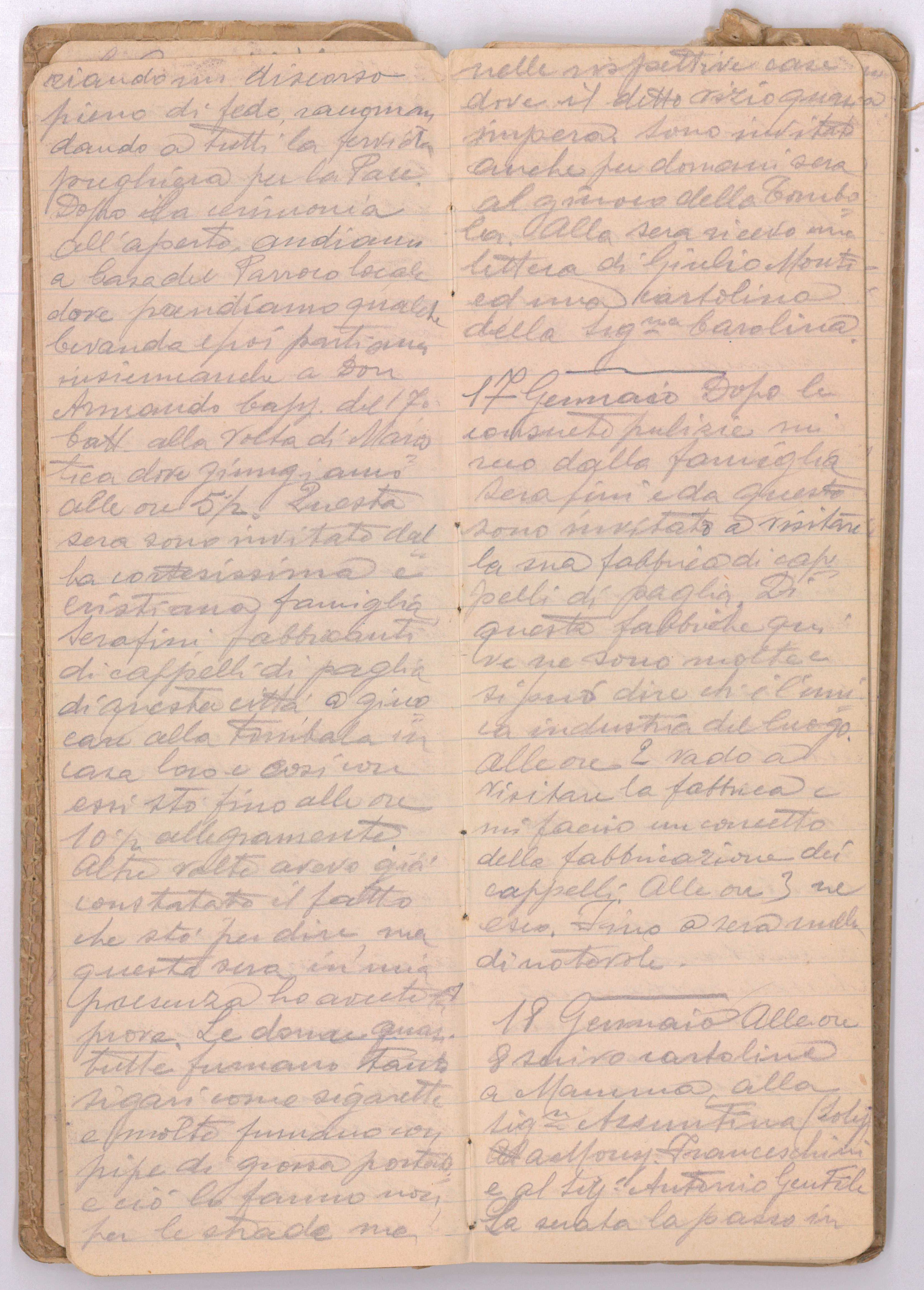 Alle ore 8 scrivo cartoline a Mamma, alla Sig.na Assuntina (Soly) a Mons. Franceschini e al Sig. Antonio Gentile. La serata la passo in casa della cortesissima famiglia della Sig.na Luigia Serafini e Mariani Via Campomarzio.