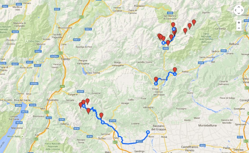 Abbiamo creato una mappa dei luoghi in cui si svolgono le vicende raccontante da Flavio durante il 1915. Cliccando sui luoghi trovate il link alla pagina (o per meglio dire ad una delle pagine) dei diari in cui compare il nome della località in questione. Abbiamo messo su mappa anche alcuni degli spostamenti descritti da Flavio.