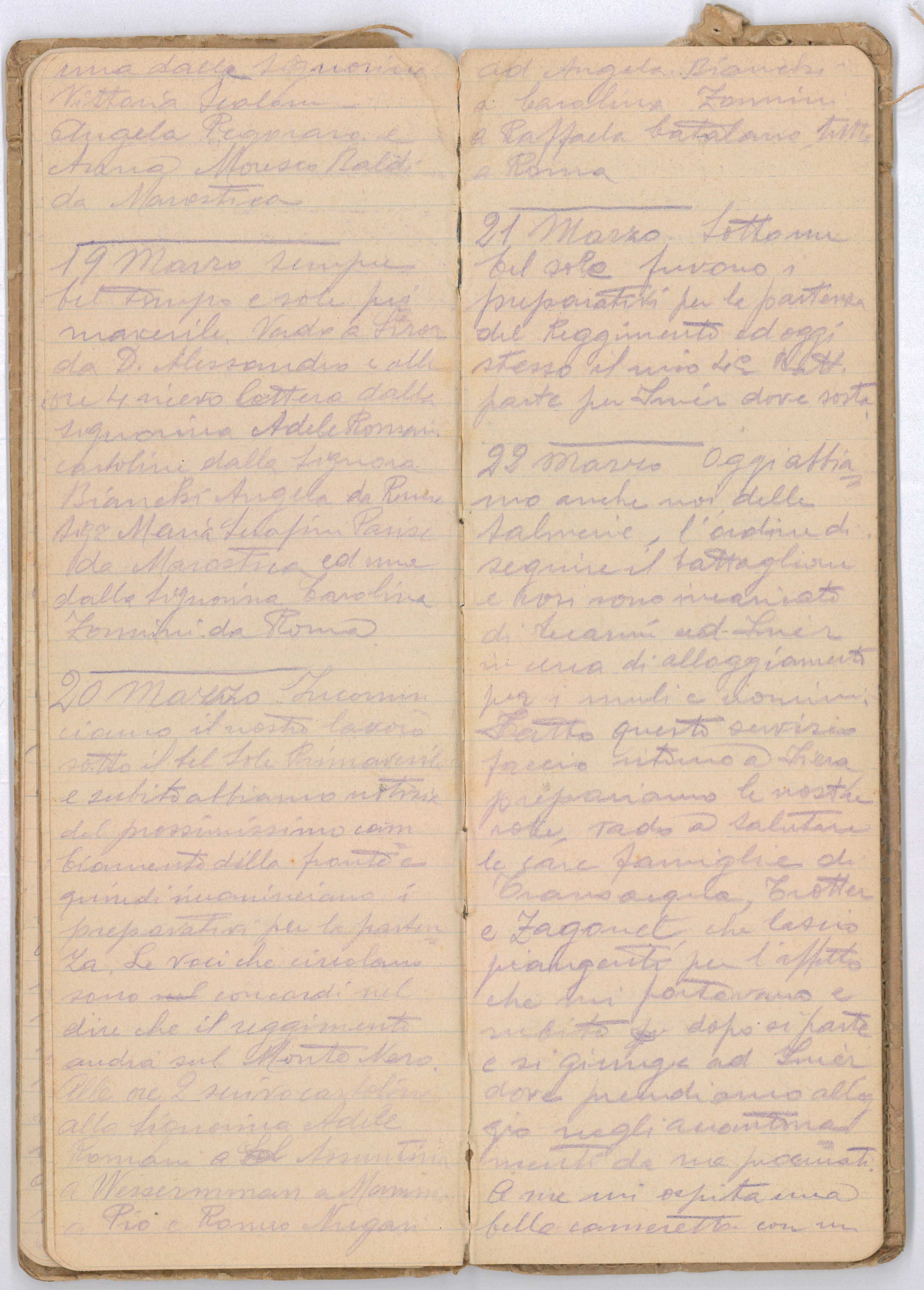 Oggi abbiamo anche noi delle salmerie, l’ordine di seguire il battaglione e […] sono incaricati di recarmi a Imer in cerca di alloggiamento per i muli e uomini. Fatto questo servizio faccio ritorno a Fiera, prepariamo le nostre robe, vado a salutare la care famiglie di Transacqua, Trotter e Zagonel, che lascio piangenti per l’affetto che mi portavano e subito dopo si parte e si giunge ad Imer dove prendiamo alloggio negli accantonamenti da me procurati. A me mi ospita una bella cameretta con un soffice letto.