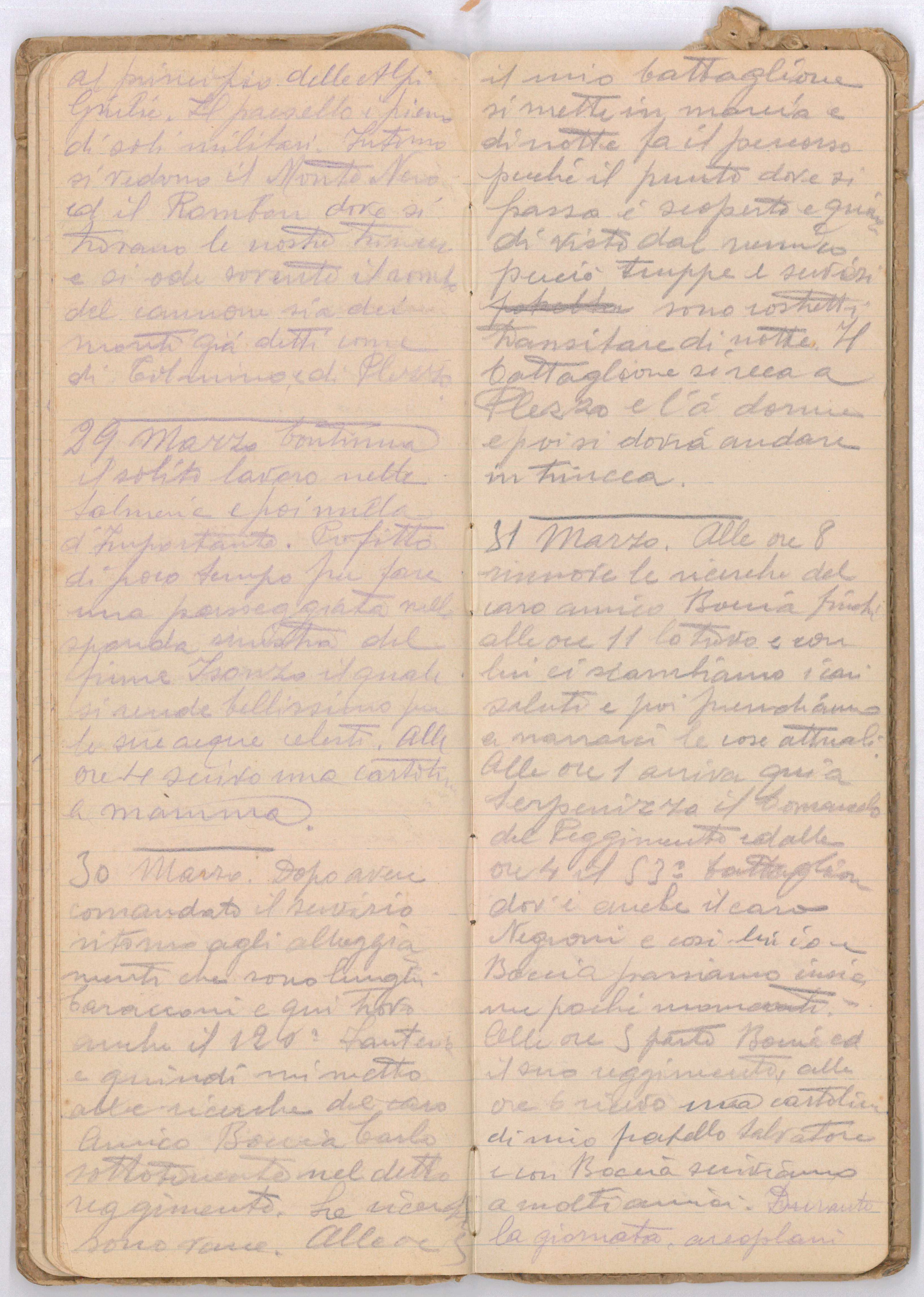 Alle ore 8 rinnovo le ricerche del caro amico Boccia finché alle ore 11 lo trovo e con lui ci scambiamo cari saluti e poi prendiamo a narrarci le cose attuali. Alle ore 1 arriva qui a Serpenizza il Comando del reggimento ed alle ore 4 il 53° battaglione dov’è anche il caro Negroni e così lui io e Boccia passiamo insieme pochi momenti. Alle ore 3 parte Boccia ed il suo reggimento, alle ore 6 ricevo una cartolina di mio fratello Salvatore e con Boccia scriviamo a molti amici. Durante la giornata, areoplani nemici volano sopra di noi.