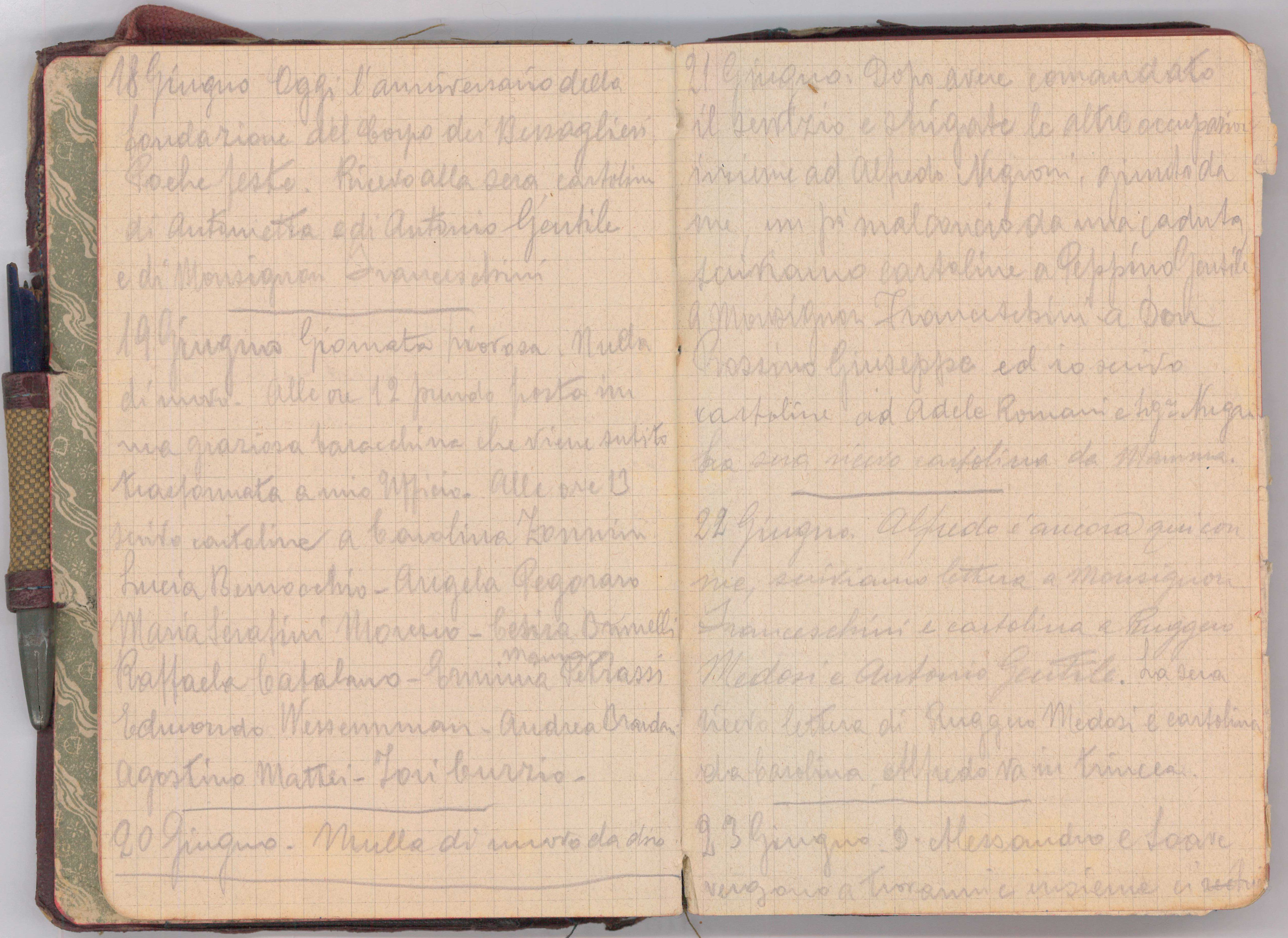 Alfredo è ancora qui con me. Scriviamo lettera a Monsignor Franceschini e cartolina a Ruggero Medosi e Antonio Gentile. La sera ricevo lettera di Ruggero Medosi e Cartolina da carolina. Alfredo va in trincea.