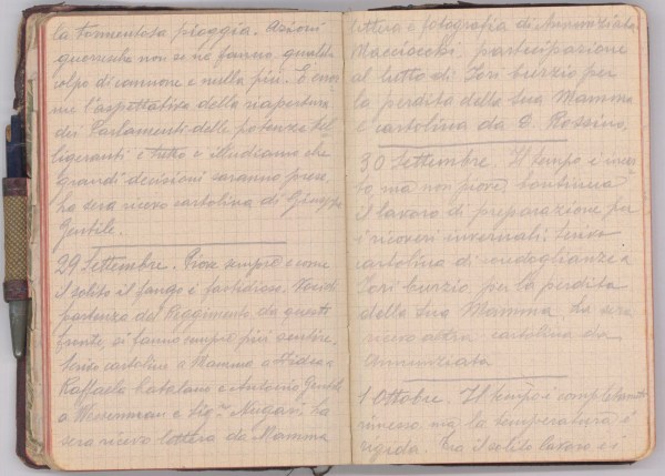 Piove sempre e come il solito il fango è fastidioso. Voci di partenza del reggimento da questo fronte, si fanno sempre più sentire. Scrivo cartoline a Mamma e Fidea a…