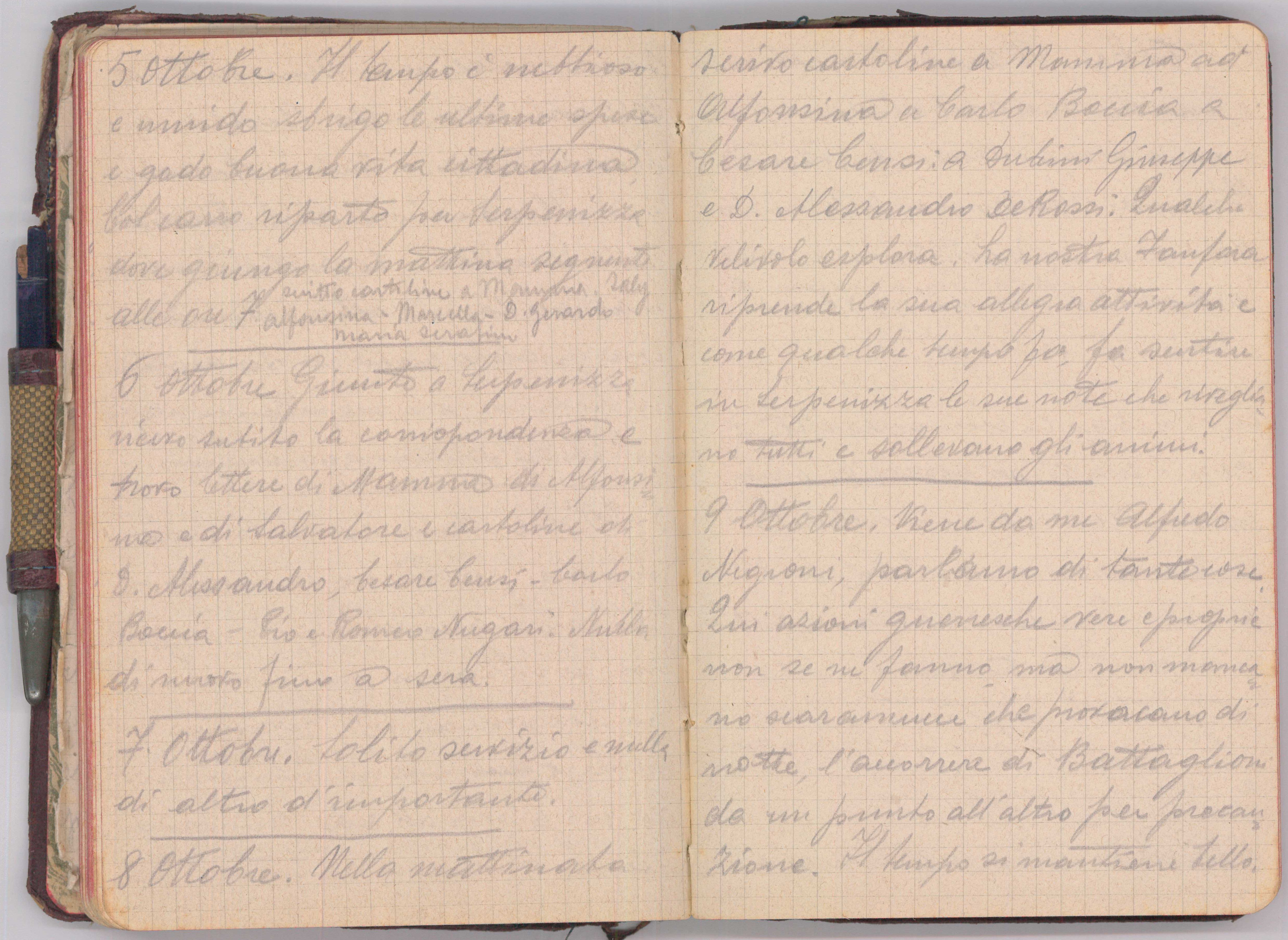 Nella mattinata scrivo cartoline a Mamma ad Alfonsina a Carlo Boccia a Cesare Censi a Dubini Giuseppe a D. Alessandro De Rossi. Qualche velivolo esplora. La nostra fanfara riprende la sua allegra attività e come qualche tempo fa, fa sentire in Serpenizza le sue note che risvegliano tutti e sollevano gli animi.