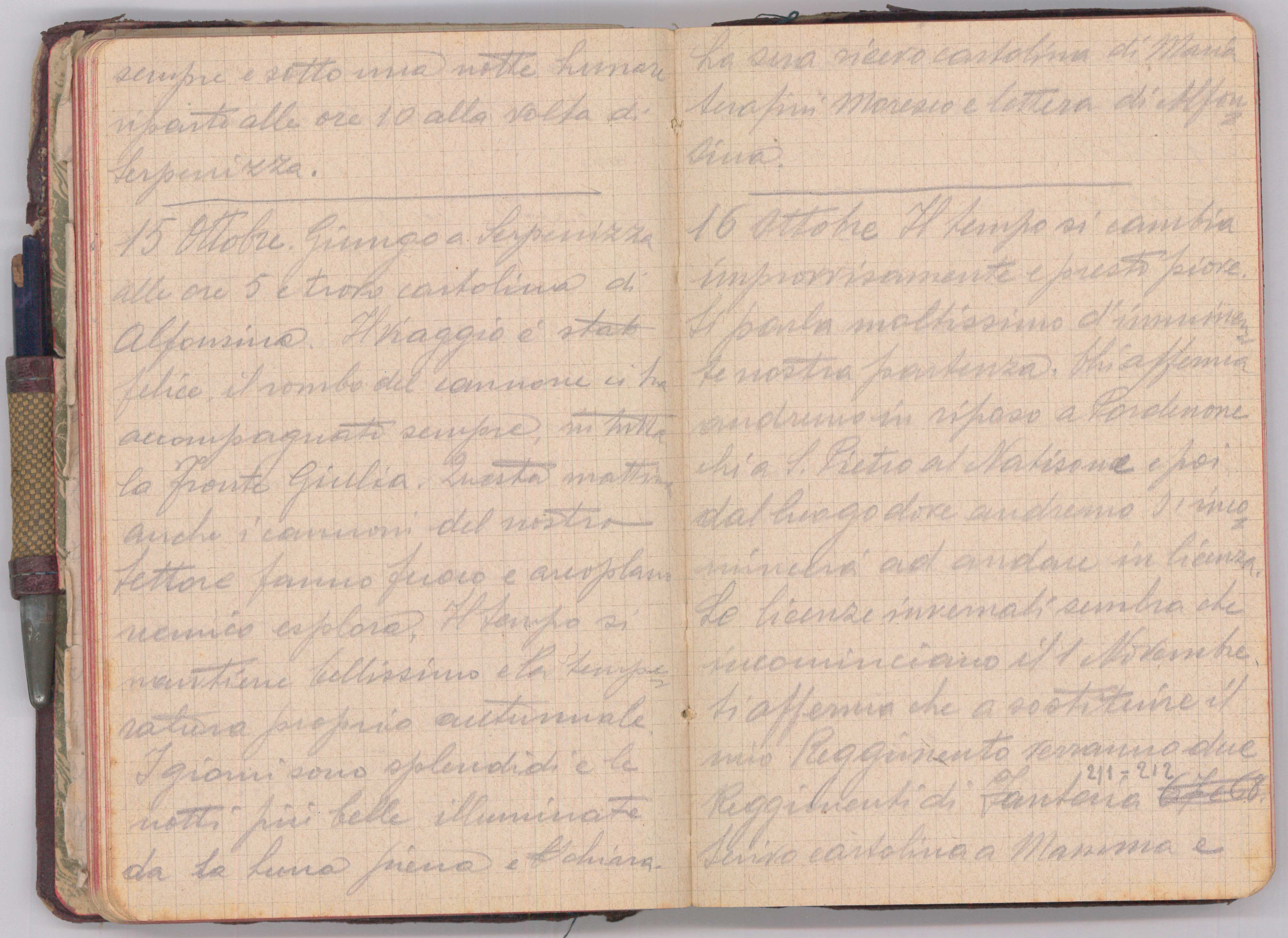 Il tempo si cambia improvvisamente e presto piove. Si parla moltissimo d’imminente nostra partenza. Chi afferma andremo in riposo a Pordenone che a S. Pietro al Natisone e poi dal luogo dove andremo s’incomincia ad andare in licenza. Le licenze invernali sembra che incominciano il 1 novembre. Se afferma che a sostituire il mio reggimento verranno due Reggimenti di fanteria 211-212. Scrivo cartolina a Mamma e Alfonsina. La sera giunge la Brigata Pescara formata dai 211 e 212 Reggimento Fanteria. Ricevo cartolina da Fidea.