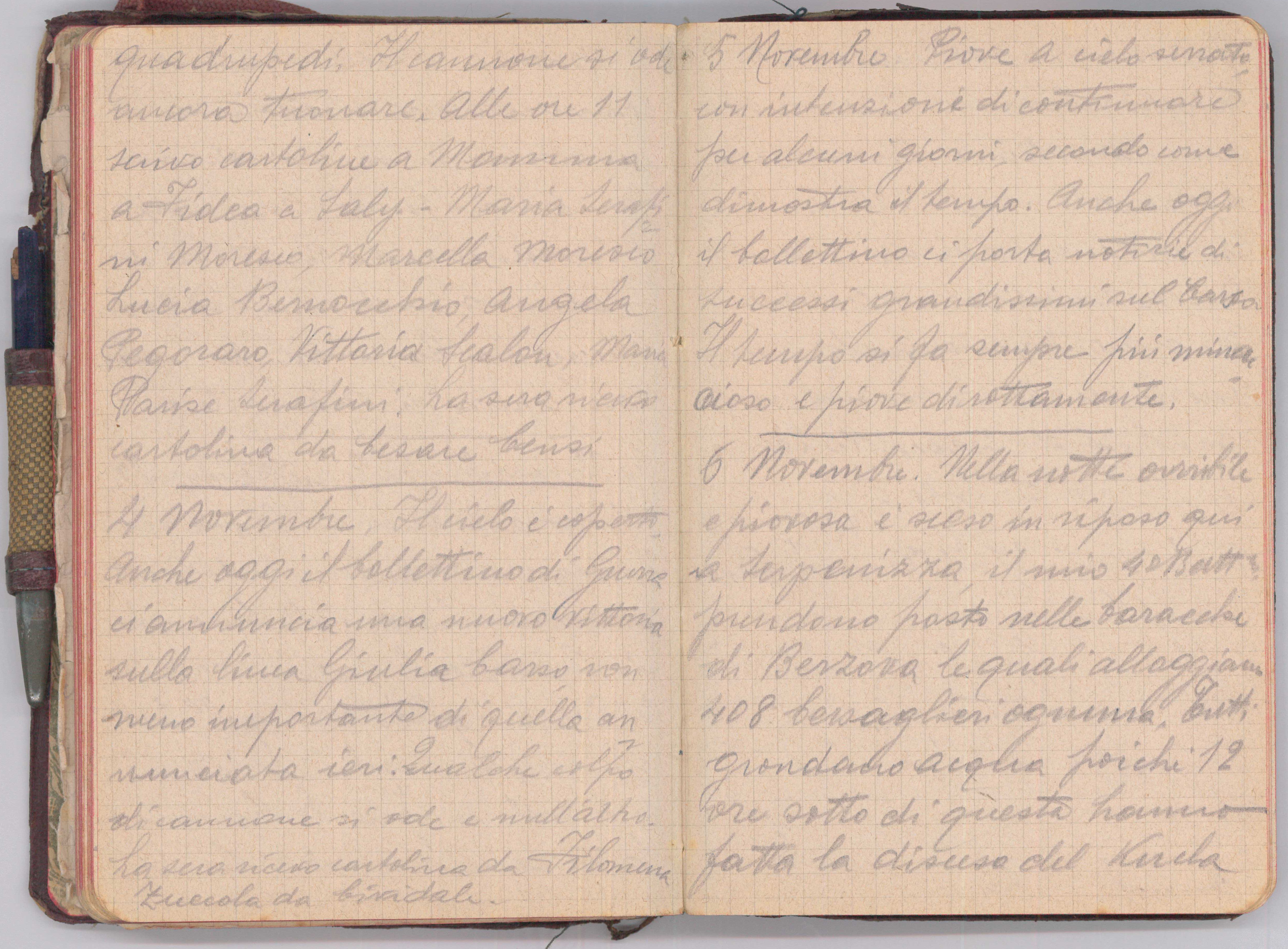 Nella notte orribile e piovosa è sceso in riposo qui a Serpenizza, il mio 4° Batt.ne prendono posto nelle baracche di Berzova le quali alloggiano 408 bersaglieri ognuna. Tutti grondano acqua poiché 12 ore sotto di questa hanno fatta la discesa del Kukla. I bersaglieri stanchi dalle lunghe sofferenze, dalla lunga marcia sotto la pioggia e affamati, perché hanno consumato l’ultimo rancio nella mezzanotte del 4 al 5, si buttano sfiniti, come morti su poche tavole approntate in quelle baracche. Piove sempre e non accenna a smettere. È sceso a Serpenizza anche il 53° Batt.ne Bersaglieri e con esso anche Alfredo Negroni, il quale non ha mancato di farmi visita. Scrivo cartolina a Filomena Zuccola a Cividale.