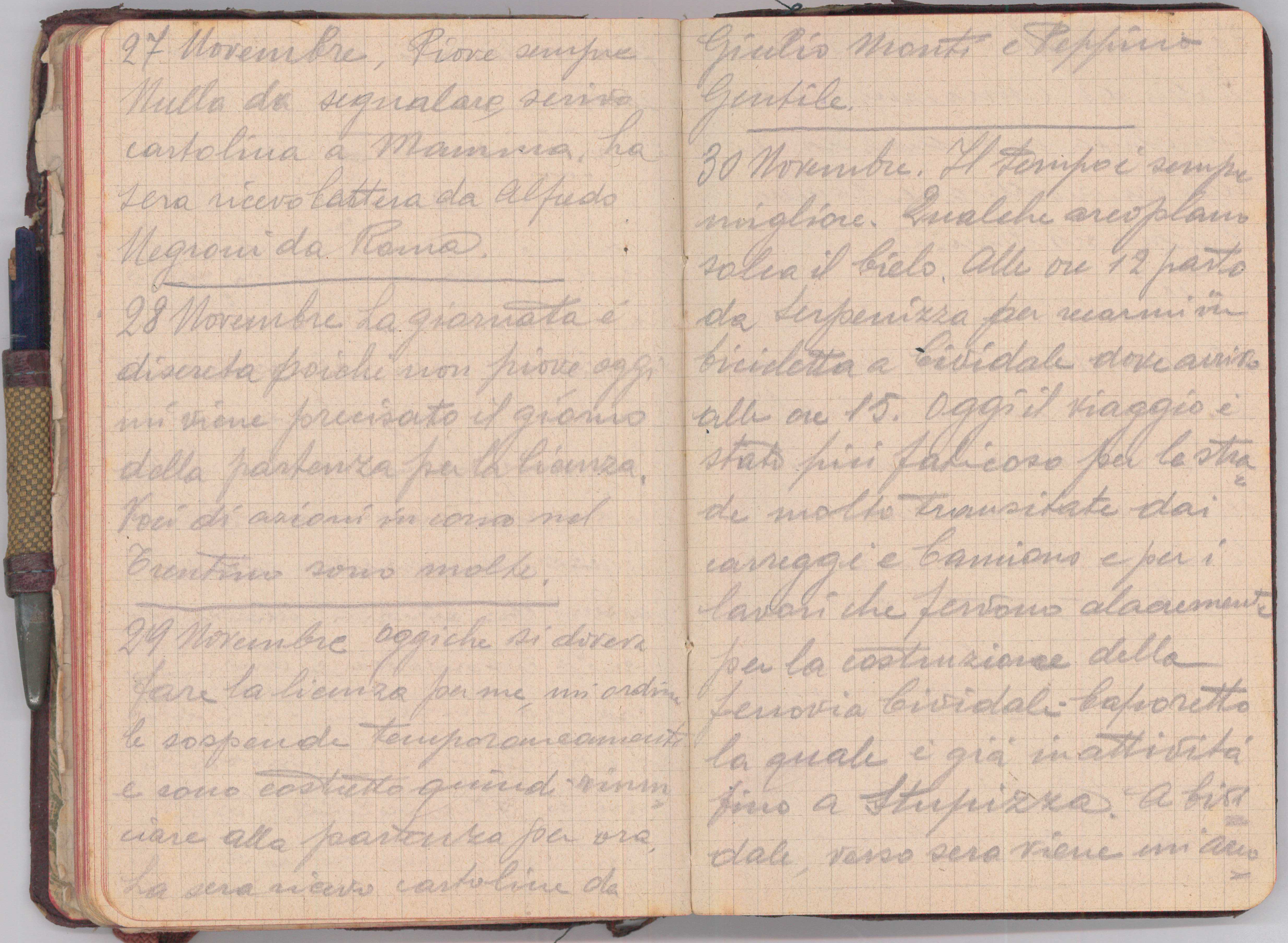 Il tempo è sempre migliore. Qualche aeroplano solca il cielo. Alle ore 12 parto da Serpenizza per recarmi in bicicletta a Cividale dove arrivo alle ore 15. Oggi il viaggio è stato più faticoso per la strade molto transitate dai carreggi e Camions e per i lavori che fervono alacremente per la costruzione della ferrovia Cividale-Caporetto la quale è già in attività fino a Stupizza. A Cividale verso sera viene un areoplano nemico che provoca il solito all’arm ma viene presto fugato dai tiri delle nostre artiglierie antiaeree. Scrivo cartoline a Mamma e Saly.