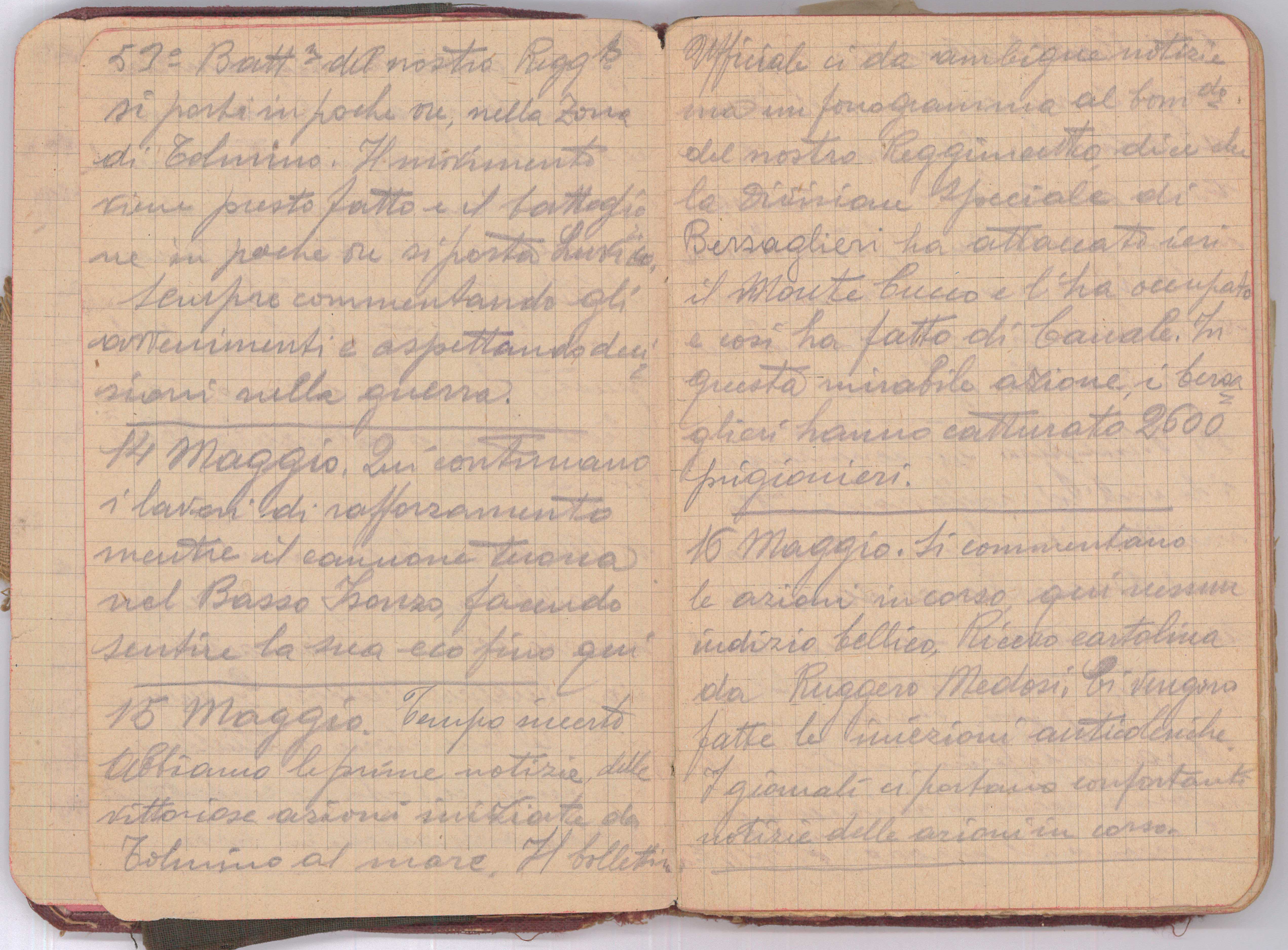 Tempo incerto. Abbiamo le prime notizie delle vittoriose azioni iniziate da Tolmino al mare. Il bollettino Ufficiale ci dà ambigue notizie ma un fonogramma al Com.do del nostro Reggimento dice che la Divisione Speciale di Bersaglieri ha attaccato ieri il Monte Cocco e l’ha occupato e così ha fatto di Canale [ndt. forse Val Canale]. In questa mirabile azione, i bersaglieri hanno catturato 2600 prigionieri.