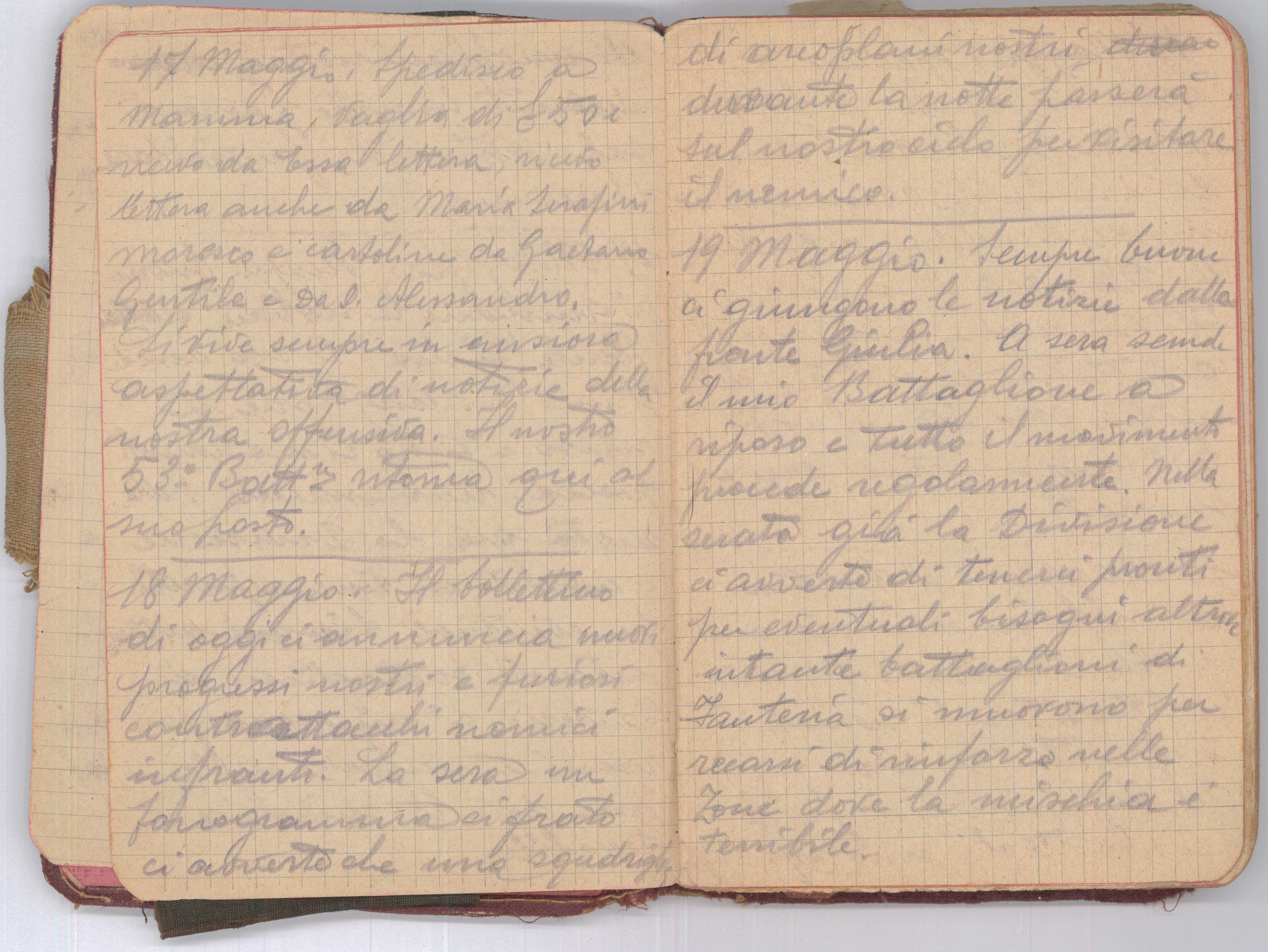 Sempre buone ci giungono le notizie dalla fronte Giulia. A sera scende il mio battaglione a riposo e tutto il movimento procede regolarmente. Nella serata già la Divisione ci avverte di tenerci pronti per eventuali bisogni altrove intanto battaglioni di Fanteria si muovono per recarsi di rinforzo nelle zone dove la mischia è terribile.