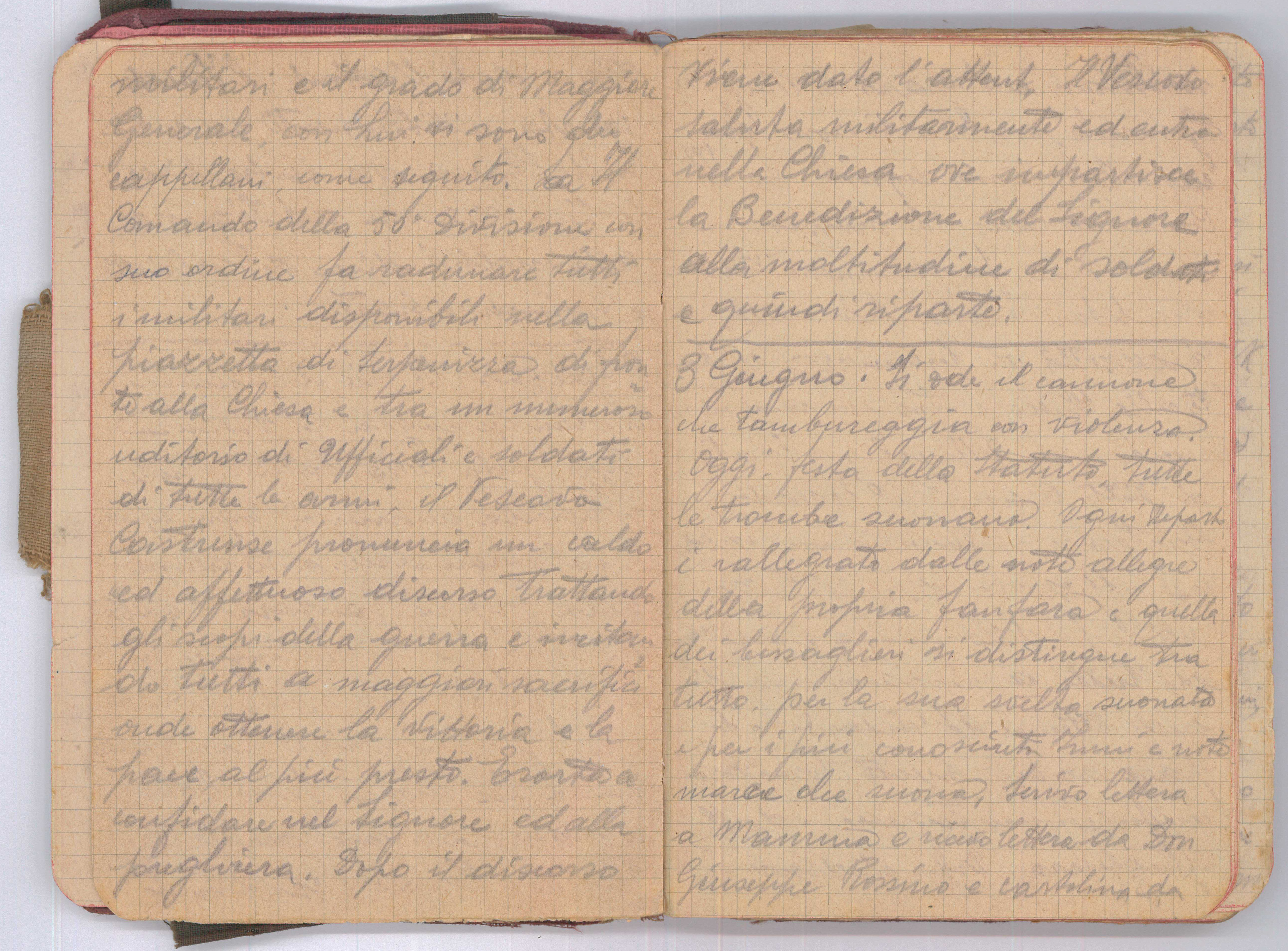 Si ode il cannone che tambureggia con violenza. Oggi, festa dello Statuto, tutte le trombe suonano. Ogni reparto è rallegrato dalle note allegre della propria fanfara e quelle dei bersaglieri si distingue tra tutte per la sua svelta suonata e per i più conosciuti Inni e nostre marce che suona, scrivo lettera a Mamma e ricevo lettera da Don Giuseppe Rossino e cartolina da Gaetano Gentile.