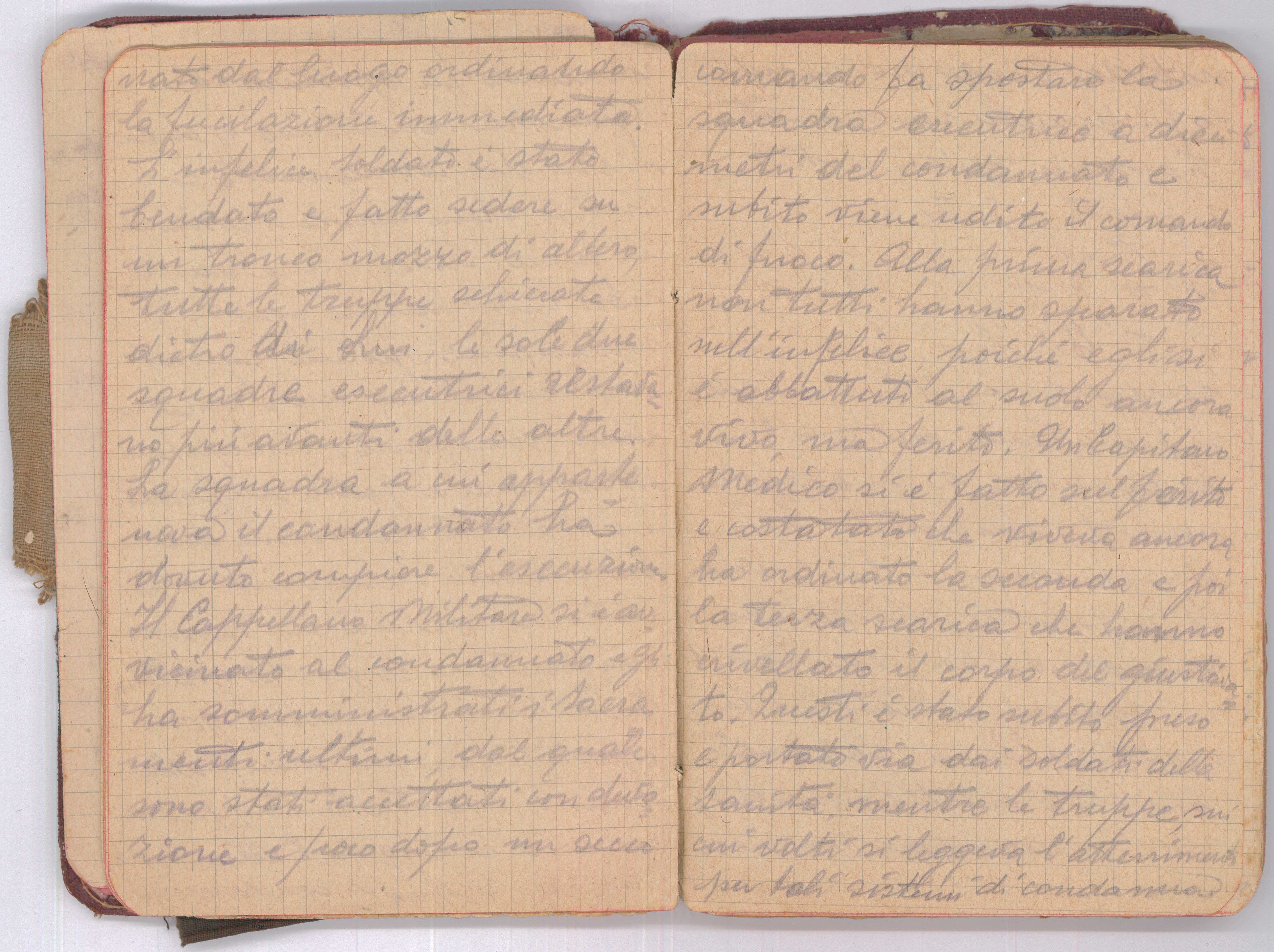 Il Reggimento mio è tutto riunito tra Prevelk Serpenizza e Berzova. Voci confuse circolano sulla nostra sorte, alcuni affermano che trascorreremo un mese qui come riposo reggimentale, altri che andremo presto sul Carso ed altri nel Trentino, insomma i più, supponiamo alla partenza. Alle ore 3 nel vicino Campo che costeggia l’Isonzo, si sono riunite tutte le truppe del Presidio per assistere al processo di due disertori del 211° fanteria. Il Colonnello Brigadiere De Marchi era Presidente del tribunale. Uno dei due soldati è stato condannato a 20 anni di reclusione e l’altro è stato condannato alla fucilazione, previa degradazione. Pronunciato il verdetto, il Colonnello De Marchi si è allontanato dal luogo ordinando la fucilazione immediata. L’infelice soldato è stato bendato e fatto sedere su un tronco mozzo di albero, tutte le truppe schierate dietro di lui, le sole due squadre esecutrici restavano più avanti delle altre. La squadra a cui apparteneva il condannato ha dovuto compiere l’esecuzione. Il Cappellano militare si è avvicinato al condannato e gli ha somministrato i sacramenti ultimi, dal quale sono stati accettati con devozione e poco dopo un secco comando ha fatto spostare la squadra esecutrice a dieci metri dal condannato e subito viene udito il comando di fuoco. Alla prima scarica non tutti hanno sparato sull’infelice, poiché egli si è abbattuto al suolo ancora vivo, ma ferito. Un Capitano Medico si è fatto sul ferito e constatato che viveva ancora ha ordinato la seconda e poi terza scarica che hanno crivellato il corpo del giustiziato. Questi è stato subito preso e portato via dal sodati della sanità, mentre le truppe, sui cui volti sui leggeva l’atterrimento per tali sistemi di condanna scioglievano le file quindi ogni reparto riprendeva la via verso la sua sede.