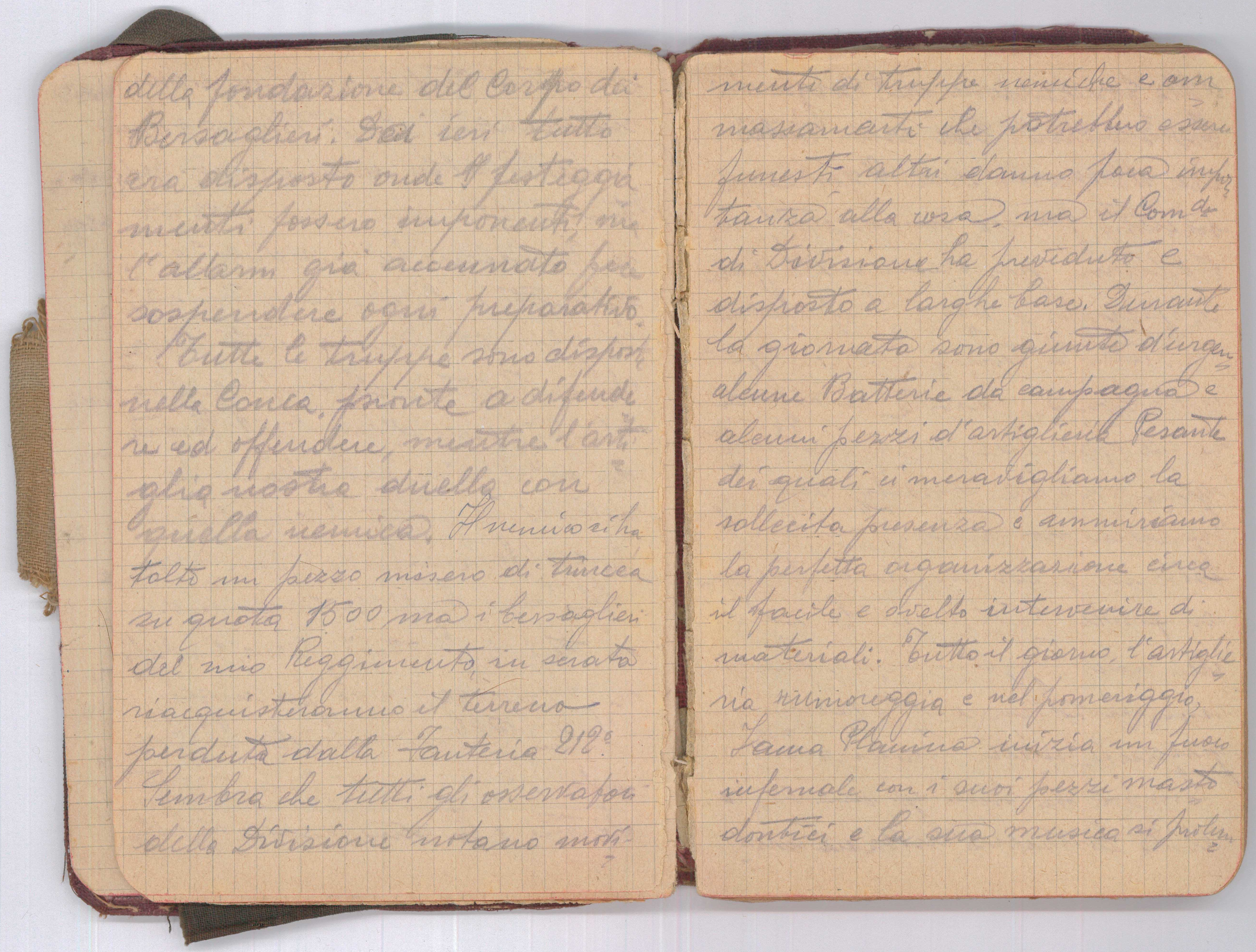 Di buon ora vado a Caporetto per acquistare generi per i festeggiamenti di domani e faccio ritorno a Serpenizza alle ore 12. Alle ore 4 si odono le trombe dei reparti suonare con insistenza ripetuti all’arm, noi abbiamo l’ordine di tenerci pronti, ma ignoriamo la causa di tutto ciò. Presto viene sospeso ogni movimento e sappiamo che forti attacchi nemici si sono sviluppati nella Conca di Plezzo e dopo lotta furiosa sono stati dai nostri respinti, quindi non necessita di rinforzi. Si ode il cannone rombare con rabbia e i pezzi su Jana Planina fare un fuoco d’inferno. Alle ore 7 un nuovo all’arm e tutti pronti dal primo, si sono presto mossi e tutto il mio Reggimento e reparti di altri corpi si sono portati nei punti destinati ai rinforzi. I cannoni d’artiglieria e colonne di mulo portano munizioni e viveri seguendo i loro reparti e più tardi le retrovie di qui, rimangono morte, senza vita, poiché tutto è stato gettato in Conca per arginare il nemico se tentasse azioni serie. Tutta la notte passa muta, il suo silenzio è rotto dai soli trasporti di munizioni che affluiscono in Conca, gli uomini tacciono e compiono tutti il loro dovere con calma serena.
