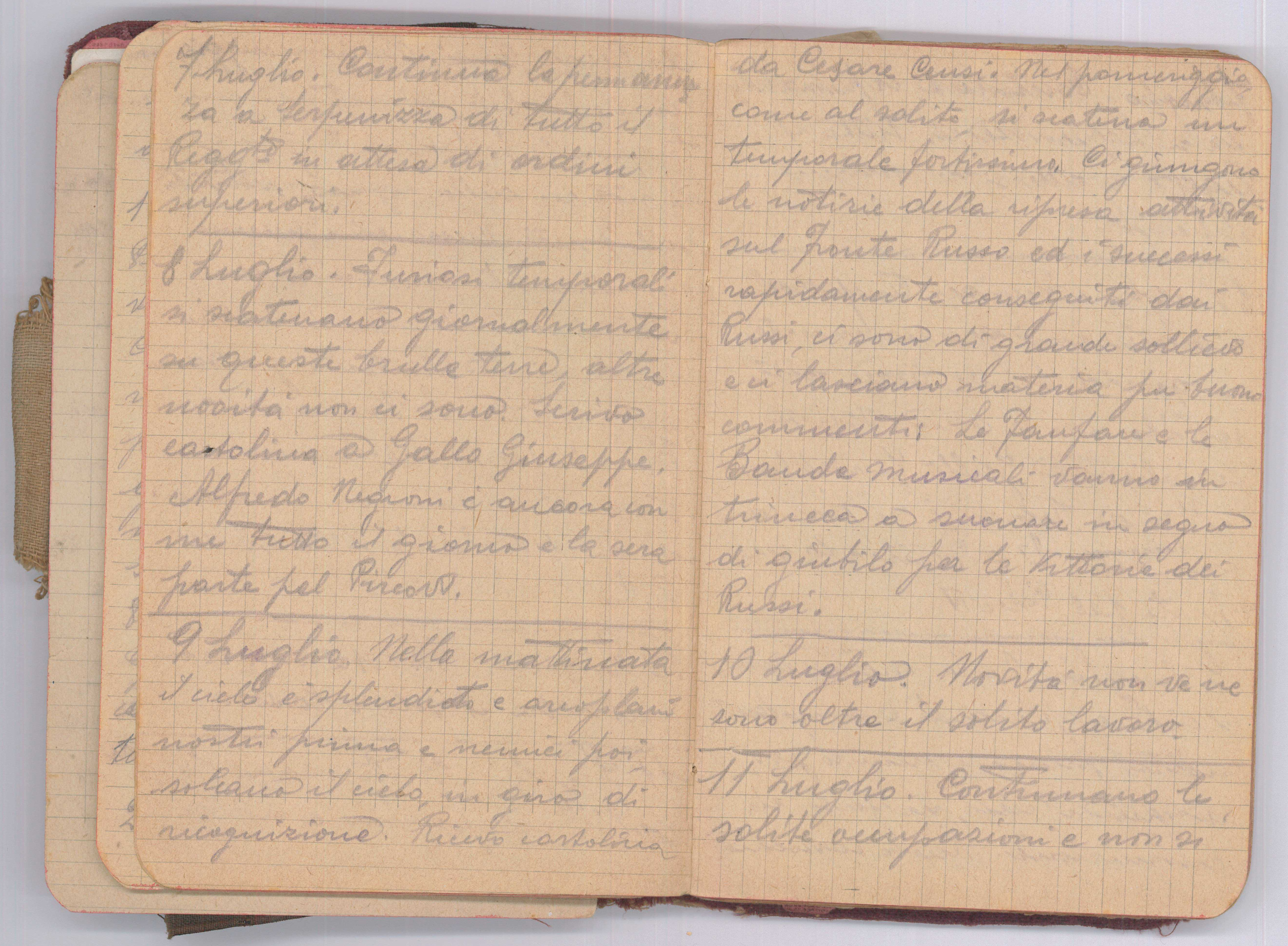 Nella mattinata il cielo è splendente e aeroplani nostri prima e nemici poi solcano il cielo in giro di ricognizione. Ricevo cartolina da Cesare Censi. Nel pomeriggio come al solito si scatena un temporale fortissimo. Ci giungono le notizie della ripresa delle attività sul Fronte Russo ed i successi rapidamente conseguiti dai Russi, ci sono di grande sollievo e ci lasciano materia per buoni commenti. Le Fanfare e le Bande musicali vanno in trincea a suonare in segno di giubilo per la vittoria dei Russi.