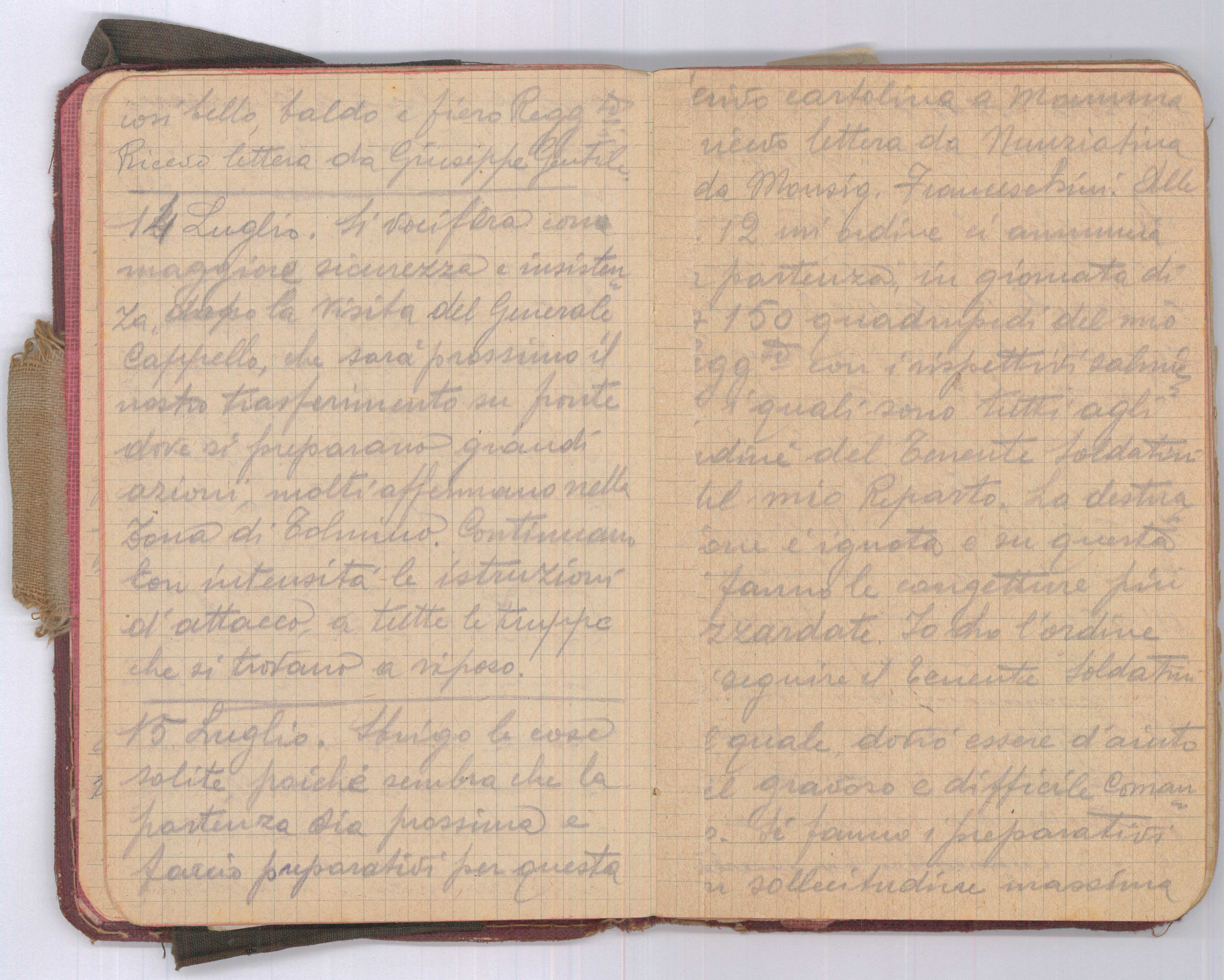 Sbrigo le cose solite poiché sembra che la partenza sia prossima e faccio preparativi per questa. Scrivo cartolina a Mamma e ricevo lettera da Nunziatina e da Monsig. Franceschini. Alle ore 12 un ordine ci annuncia la partenza in giornata di 150 quadrupedi del mio regg.to con i rispettivi salmieri, i quali sono tutti agli ordini del Tenente Soldatini del mio reparto. La destinazione è ignota e su questo si fanno le congetture più azzardate. Io ho l’ordine di seguire il tenente Soldatini al quale dovrò essere d’aiuto nel gravoso e difficile comando. Si fanno i preparativi con sollecitudine massima e alle ore 20 la Colonna muli è già riunita e si muove verso Caporetto. La colonna è interminabile, ed io con la bicicletta devo sorvegliare il buon ordine di marcia. Subito appena partiti sappiamo di essere diretti a Idersko [ndr. Idresca d’Isonzo] dove giungiamo dopo tre ore di marcia. Qui ad Idersko prendiamo posto in case già disposte per noi e restiamo a disposizione del 28° Regg.to artiglieria di Campagna per rifornimento munizioni.