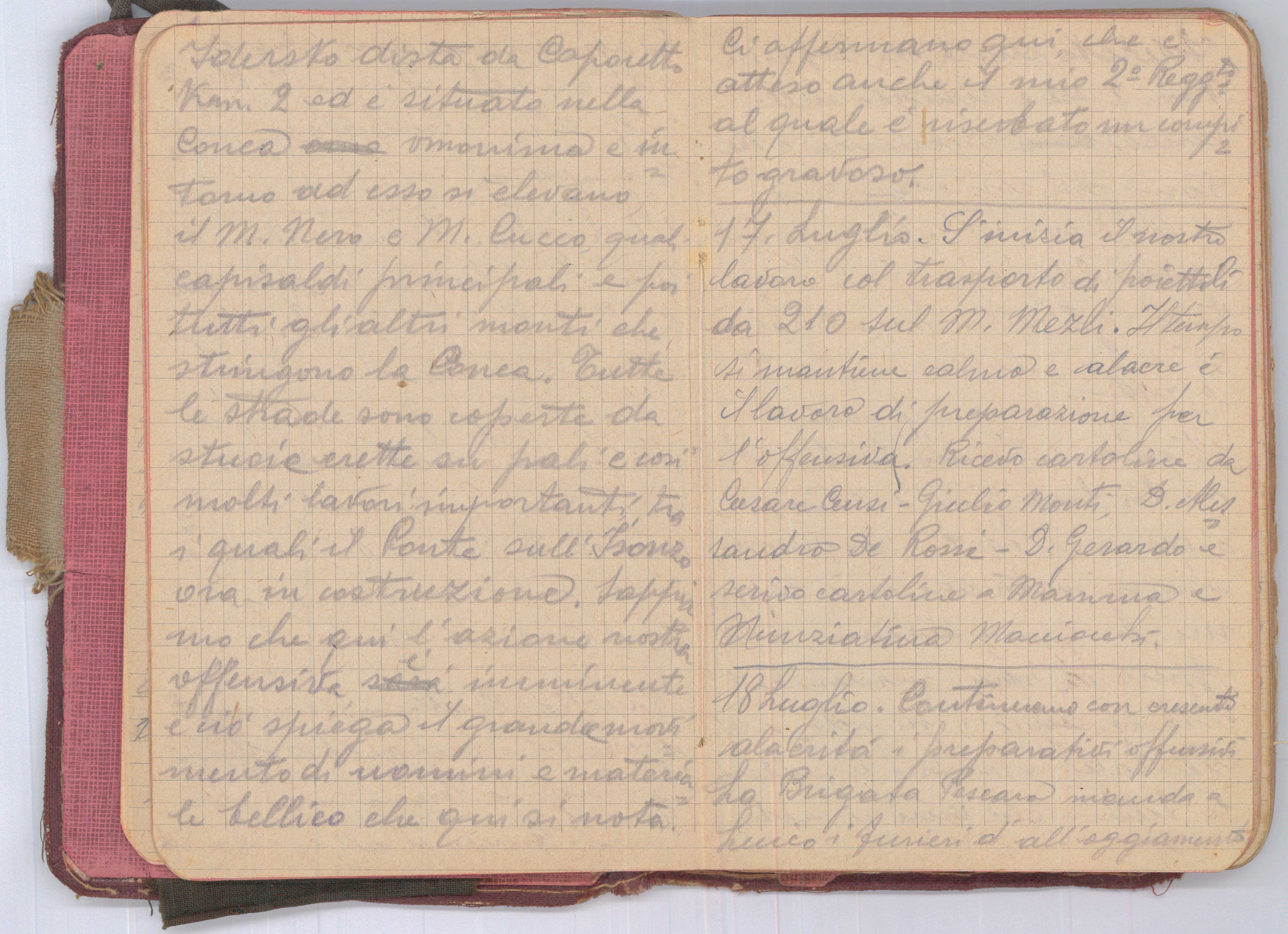 S’inizia il nostro lavoro col trasporto di proiettili da 210 sul M. Merzli. Il tempo si mantiene calmo e alacre è il lavoro di preparazione per l’offensiva. Ricevi cartoline da Cesare Censi – Giulio Monti, D. Alessandro De Rossi D. Gerardo e scrivo cartoline a Mamma e Nunziatina Macciacebi.