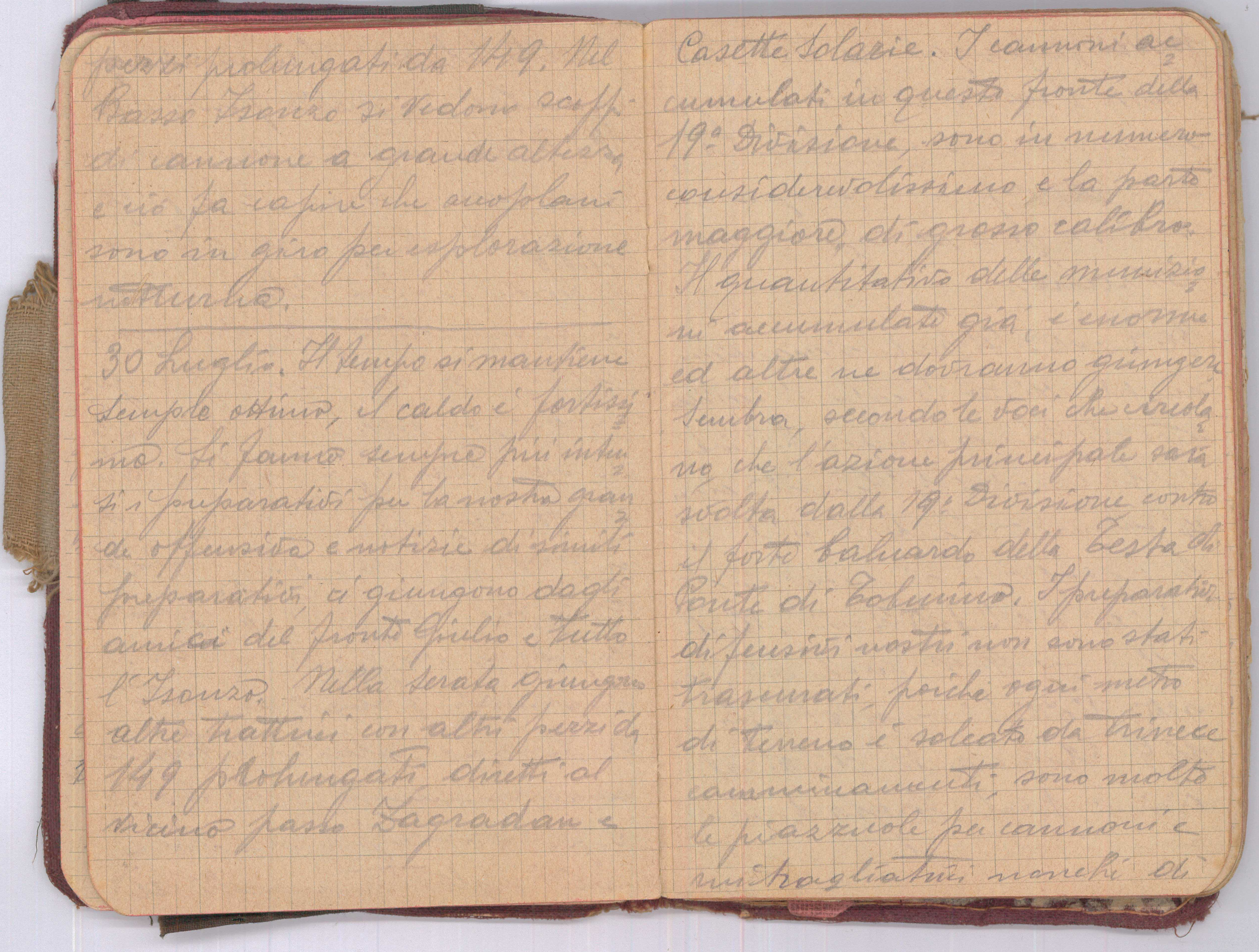 Il tempo si mantiene sempre ottimo, il caldo è fortissimo. Si fanno sempre più intensi i preparativi per la nostra grande offensiva e notizie di simili preparativi ci giungono dagli amici del fronte Giulio e tutto l’Isonzo. Nella serata giungono altri pezzi da 149 prolungati, diretti al vicino passo Zagradan e Casette Solarie. I cannoni accumulati in questo fronte della 19° divisione, sono in numero considerevolissimo e la parte maggiore di grosso calibro. Il quantitativo delle munizioni accumulate già è enorme ed altre ne dovranno giungere sembra, secondo le voci che circolano, che l’azione principale sarà svolta dalla 19° divisione, contro il forte baluardo della testa di ponte di Tolmino. I preparativi difensivi nostri non sono stati trascurati, poiché metro di terreno è solcato da trincee camminamenti; sono molte le piazzuole per cannoni e mitragliatrici nonché di profonde caverne per ricovero. I fili telegrafici e telefonici per le comunicazioni sono messi bene al coperto sottratti da qualunque tentativo nemico di distruzione, le posizioni più elevate sono fortemente e minuziosamente munite di mezzi difensivi, ciò che rende inaccessibili al nemico questa zona. Le strade di comunicazione sono moltissime, tutte fatte nel periodo della guerra. Mancano quasi del tutto i baraccamenti nelle retrovie, ma ve ne sono molti per la truppa nella zona più avanzata. Il cannone trema ovunque e rompe il silenzio della bella serata lunare.