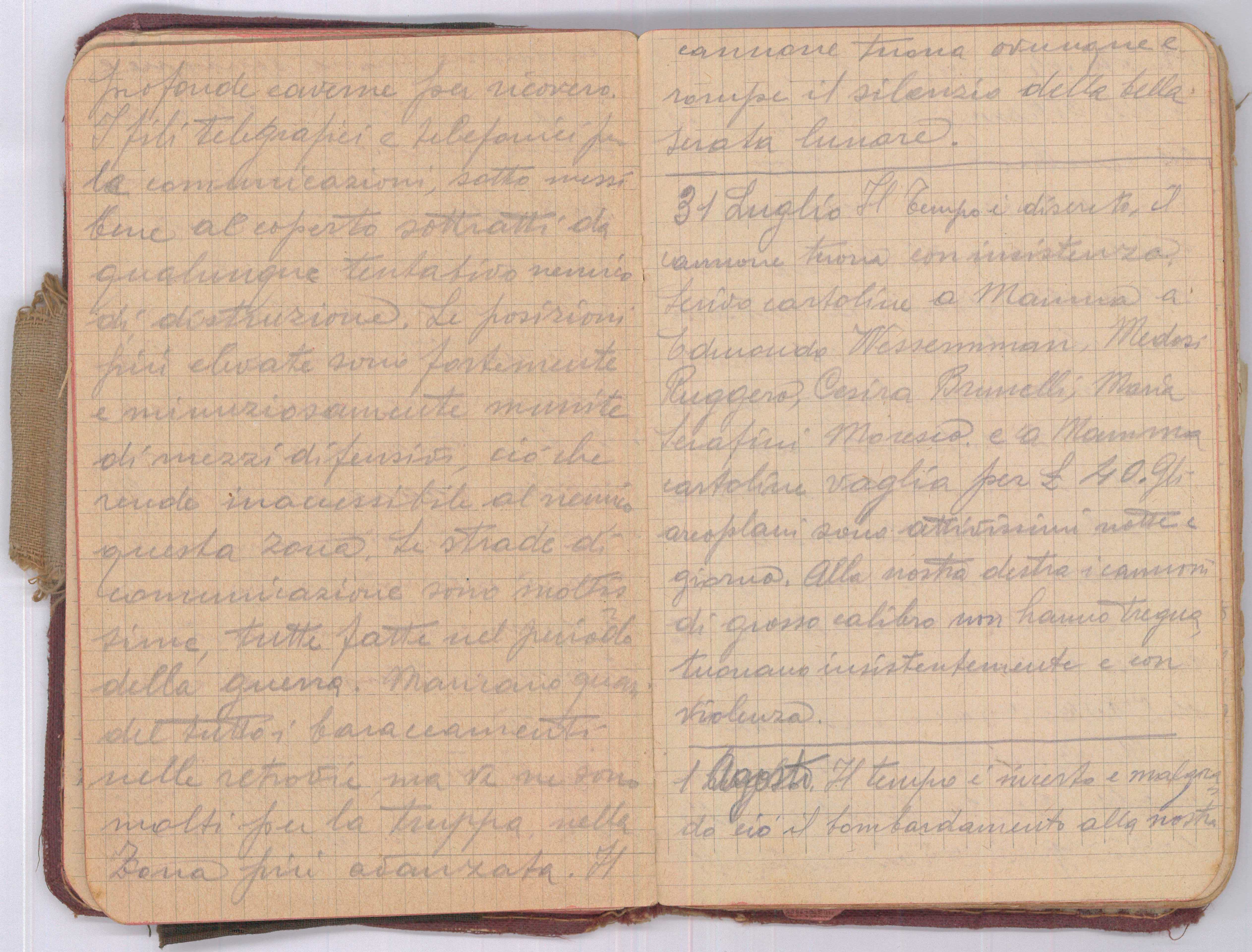 Il tempo è discreto, il cannone tuona con insistenza. Scrivo cartoline a mamma a Edmondo Wesserman, Medosi Ruggero, Cesira Brunelli, Maria Serafini Moresco e a mamma cartoline vaglia per £ 40. Gli aeroplani sono attivissimi notte e giorno. Alla nostra destra i cannoni di grosso calibro non hanno tregua tuonano insistentemente e con violenza.