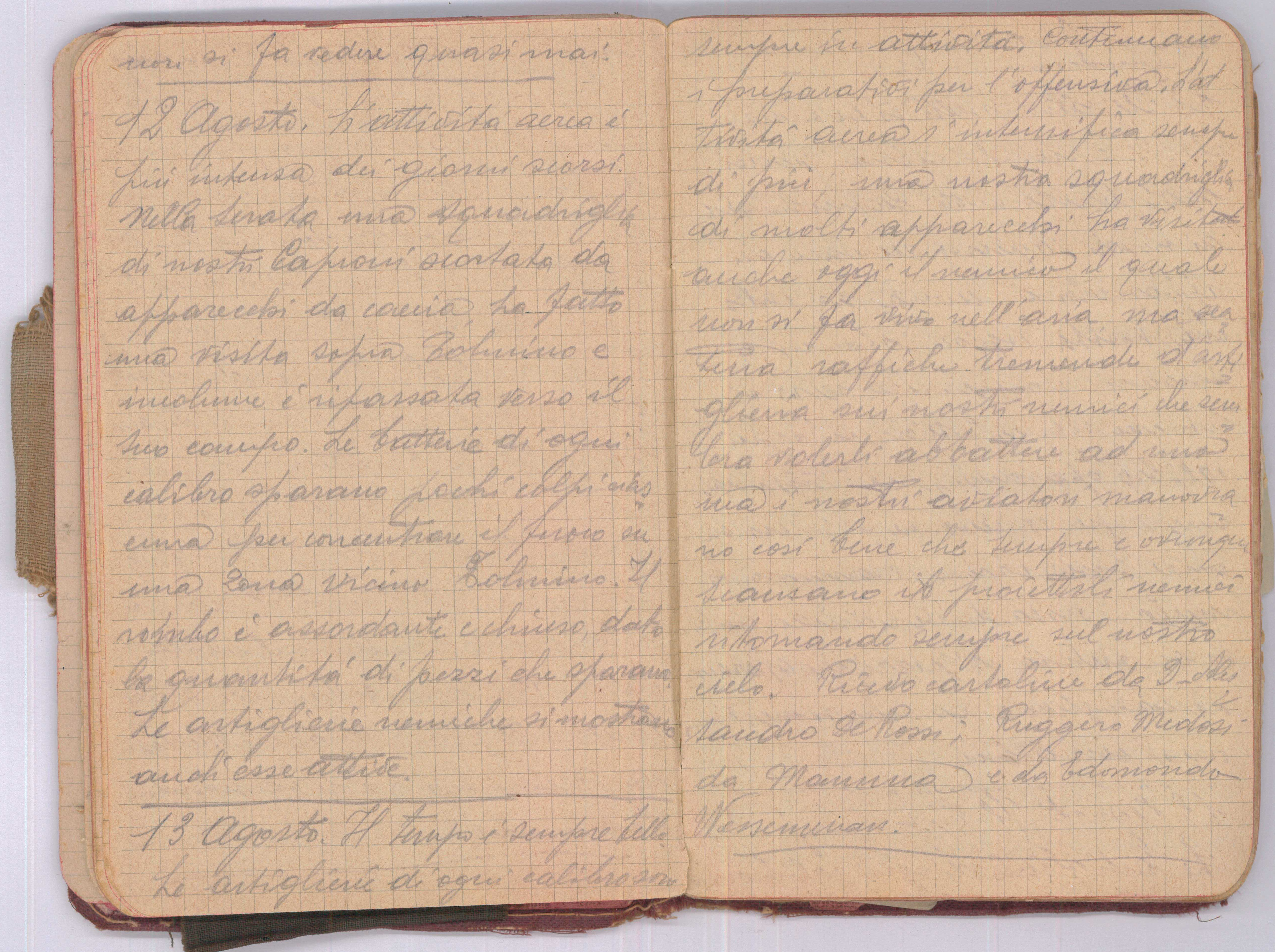 L’attività aerea è più intensa dei giorni scorsi. Nella serata una squadriglia di nostri Caproni scortata da apparecchi da caccia, ha fatto una visita sopra a Tolmino e incolume è ripassata verso il suo campo. Le batterie di ogni calibro sparano pochi colpi ciascuna per concentrare il fuoco su una zona vicino a Tolmino. Il rombo è assordante e chiuso, dato la quantità di pezzi che sparano. Le artiglierie nemiche si mostrano anche esse attive.