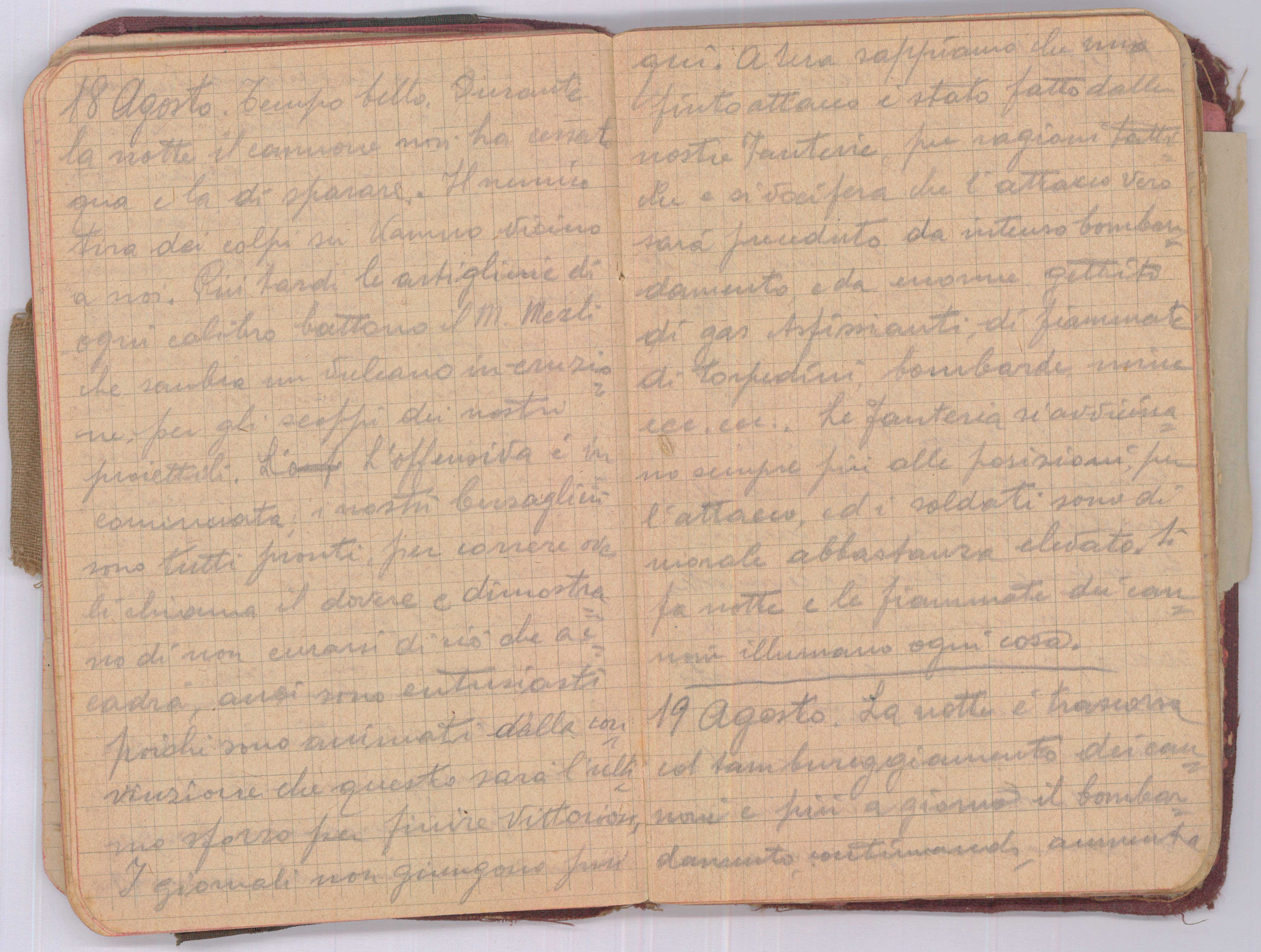 Il tempo è bello. Durante la notte il cannone non ha cessato qua e la di sparare. Il nemico tira dei colpi su Canin vicino a noi. Più tardi le artiglierie di ogni calibro battono il M. Merzli che sembra un vulcano in eruzione per gli scoppi dei nostri proiettili. L’offensiva è incominciata, i nostri bersaglieri sono tutti pronti per correre ove li chiama il dovere e dimostrare di non curarsi di ciò che accadrà, anzi sono entusiasti poiché sono animati dalla convinzione che questo sarà l’ultimo sforzo per finire vittoriosi. I giornali non giungono più qui. A sera sappiamo che un finto attacco è stato fatto dalla nostra Fanteria per ragioni tattiche e si vocifera che l’attacco vero sarà preceduto da intenso bombardamento e da enorme gettito di gas asfissianti, di fiammate, di torpedini, bombarde, mine ecc. ecc. Le fanterie si avvicinano sempre più alle posizioni per l’attacco ed i soldati sono di morale abbastanza elevato. Si fa notte e le fiammate dei cannoni illuminato ogni cosa.