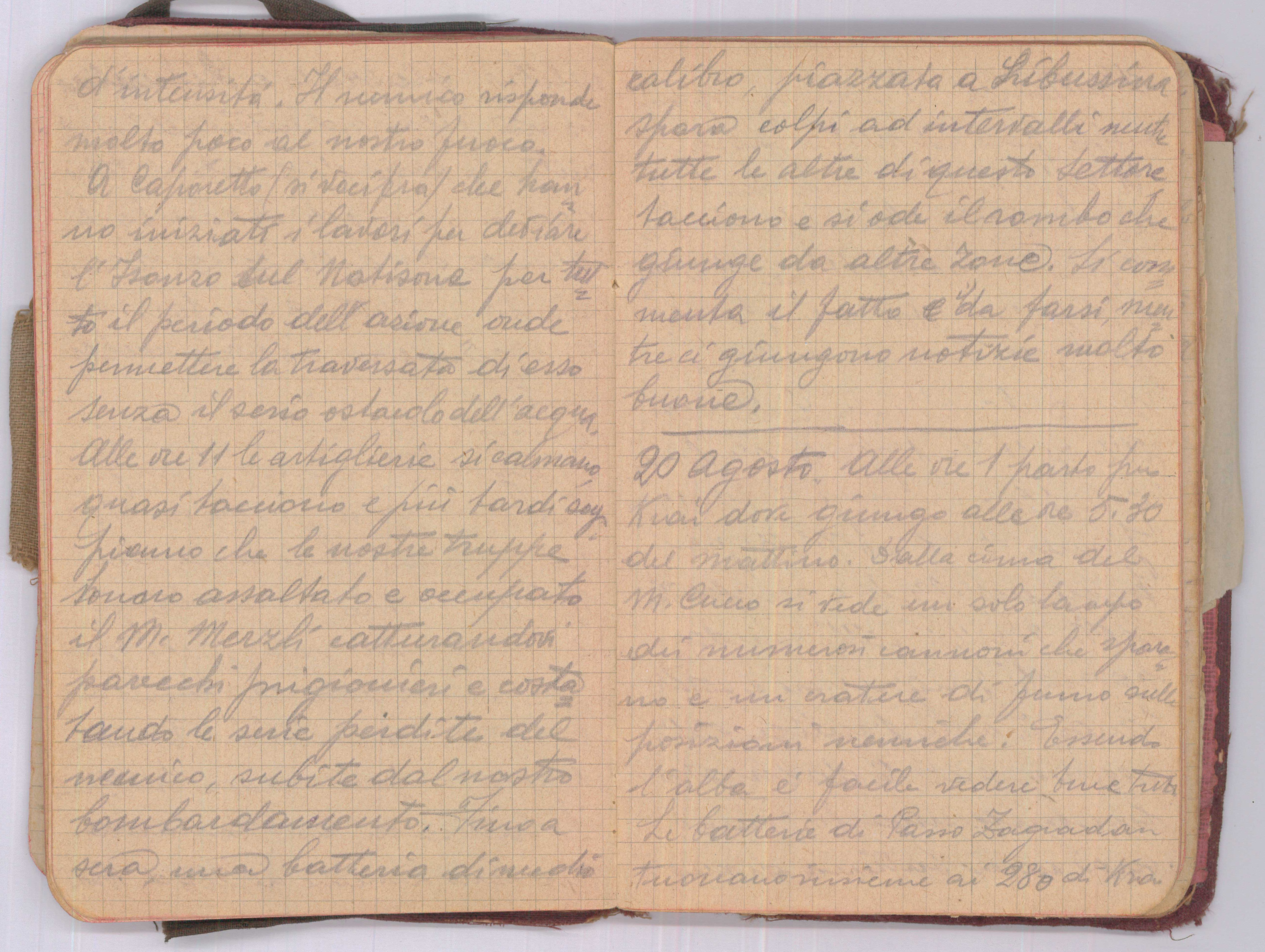 Alle ore 1 parto per Krai dove giungo alle ore 5.30 del mattino. Dalla cima del M. Cucco si vede un solo lampo dei numerosi cannoni che sparano e un cratere di fumo sulle posizioni nemiche. Essendo l’alba è facile vedere bene tutto. Le batterie di Passo Zagradan tuonano insieme ai 280 di Krai. Alle ore 12 ho sbrigato le cose per cui sono venuto, presso la 137° Batteria d’assedio e vado a riposare dalla cara amica Tonina Crinich a Zuodar simpaticissima e affettuosa slava diciannovenne. Ilo 207 il 208-211-212 Fanteria sono qui di passaggio per attaccare S. Lucia di Tolmino cosa che accadrà forse domani. Giunge notizia che è stato occupato il M. Fratta e sono stati catturati 7000 prigionieri. La stampa si pubblica nuovamente in zona d’operazioni.