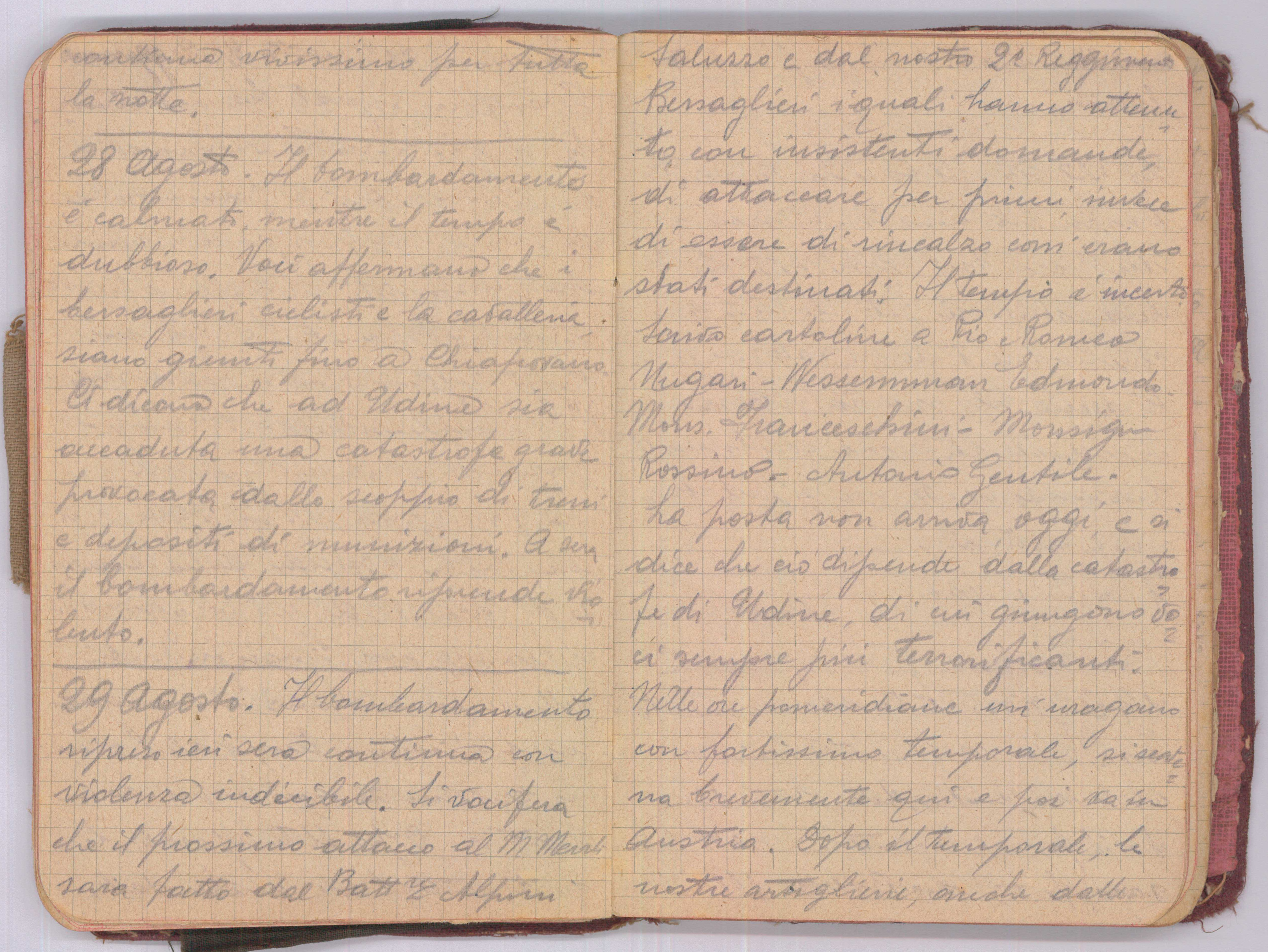 Il bombardamento ripreso ieri sera continua con violenza indicibile. Si vocifera che il prossimo attacco al M. Merlzi sarà fatto dal Batt.ne Alpini Saluzzo e dal nostro 21° Reggimento Bersaglieri i quali hanno ottenuto con insistenti domande, di attaccare per primi, invece di essere di rincalzo com’erano stati destinati. Il tempo è incerto. Scrivo cartoline a Pio e Romeo Nugari – Wesserman Edmondo – Monsig. Franceschini – Monsig. Rossino – Antonio Gentile. La posta non arriva oggi e si dice che ciò dipende dalla catastrofe di Udine, di cui giungono voci sempre più terrificanti. Nelle ore pomeridiane un uragano con fortissimo temporale, si scatena ma brevemente qui e poi va in Austria. Dopo il temporale, le nostre artiglierie, anche dalle zone lontane, si odono tuonare di una violenza senza precedenti, ma il fuoco così vivo dura poco tempo. Crediamo che il nemico abbia (come suo solito) approfittato della tempesta per tentare di sorprendere i nostri valorosi soldati nella loro marcia vittoriosa. Durante la notte continua il bombardamento che si può chiamare normale.
