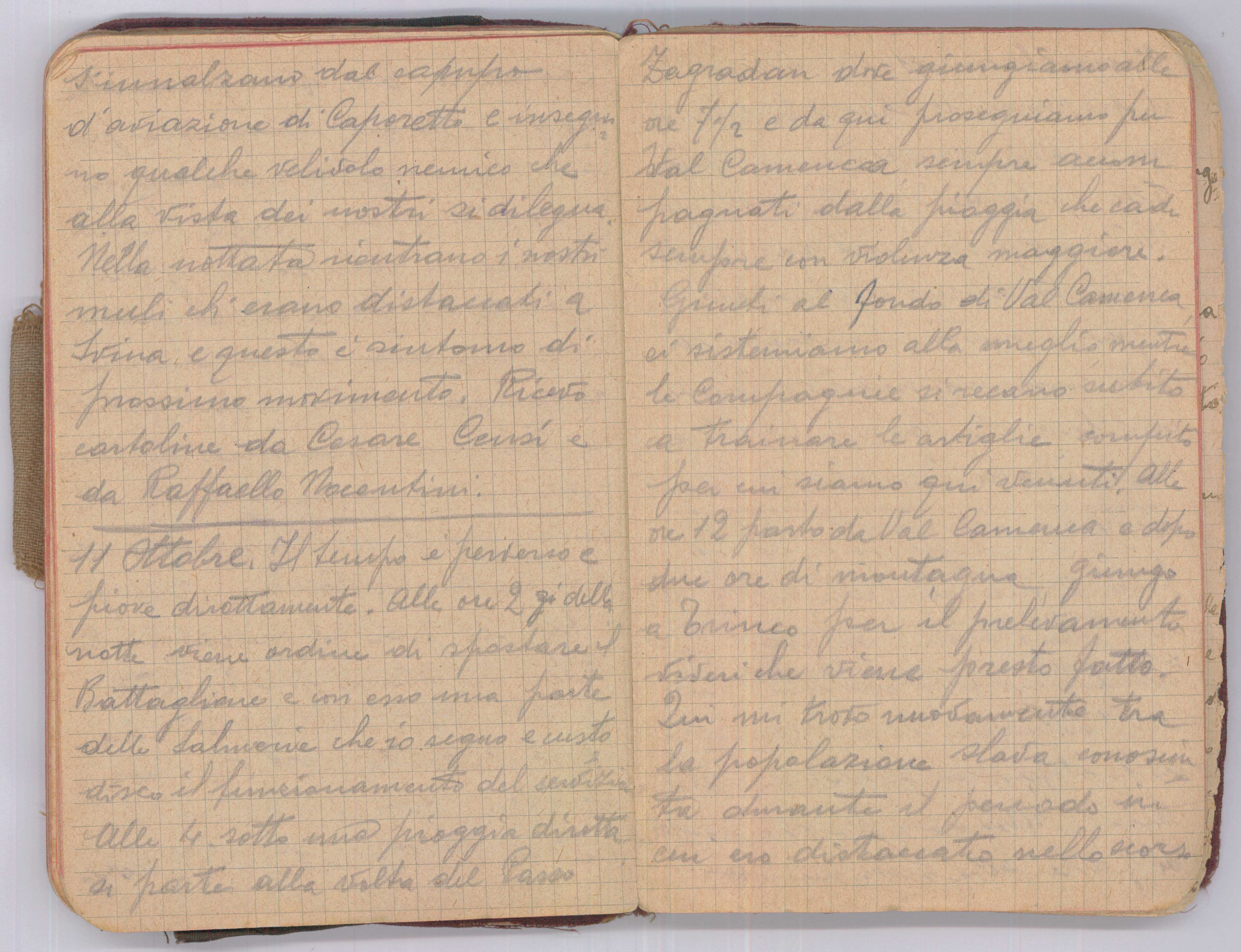 Il tempo è perverso e piove dirottamente. Alle ore 2 della notte viene ordine di spostare il Battaglione e con esso una parte delle salmerie che io seguo e custodisco il funzionamento del servizio. Alle 4 sotto una pioggia dirotta si parte alla volta del Passo Zagradan dove giungiamo alle ore 7 ½ e da qui proseguiamo per Val Camenca, sempre ancora bagnati dalla pioggia che cade sempre con violenza maggiore. Giunti al fondo di Val Comenca ci sistemiamo alla meglio mentre le Compagnie si recano subito a trainare le artiglie[rie] compito per cui siamo qui venuti. Alle ore 12 parto da Val Camenca e dopo due ore di montagna giungo a Trinco per il prelevamento viveri che viene presto fatto. Qui mi trovo nuovamente tra la popolazione slava conosciuta durante il periodo in cui ero distaccato nello scorso luglio e agosto per il servizio munizioni. Sono bagnato gocciolante da cima a fondo e vado dalla Sig.na Tonina Crainich mia cara amica dove trovo ospitalità e posso cambiarmi la biancheria e riscaldare le mie fredde membra vicino ad un bellissimo focolare. In questo paese sono accampate 3 Brigate di fanteria e molte compagnie di mitragliatrici pronti tutti per chissà quale compito. Alle ore 6 parto e faccio ritorno a valle Camenca.