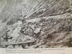 Abbiamo ricevuto da Oreste Rossi, della Società per la Guerra Bianca, e amico de “Il blog di un bersagliere”, un documento eccezionale. Oreste leggendo il libro L’ultima retroguardia ha notato questa foto che pubblichiamo. Rappresenta, secondo quanto dice la didascalia, i Bersaglieri del 2° Reggimento mentre passano l’Isonzo durante la ritirata di Caporetto.