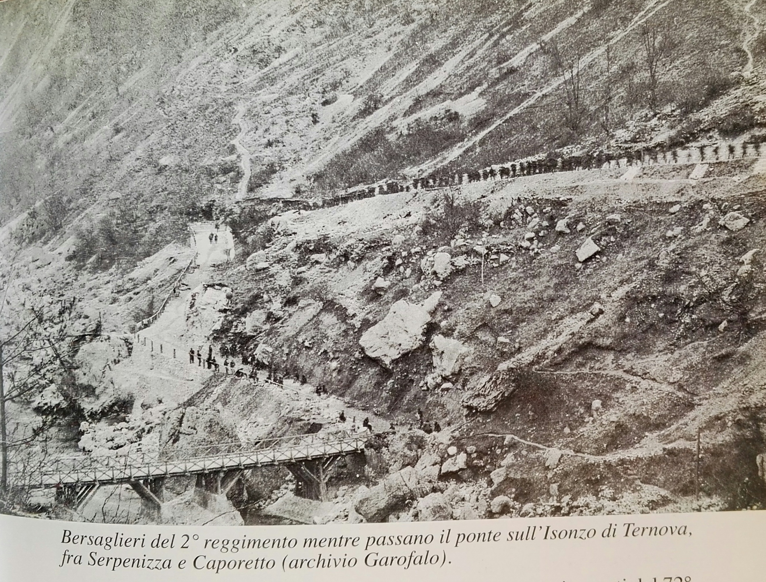 Abbiamo ricevuto da Oreste Rossi, della Società per la Guerra Bianca, e amico de “Il blog di un bersagliere”, un documento eccezionale. Oreste leggendo il libro L’ultima retroguardia ha notato questa foto che pubblichiamo. Rappresenta, secondo quanto dice la didascalia, i Bersaglieri del 2° Reggimento mentre passano l’Isonzo durante la ritirata di Caporetto.