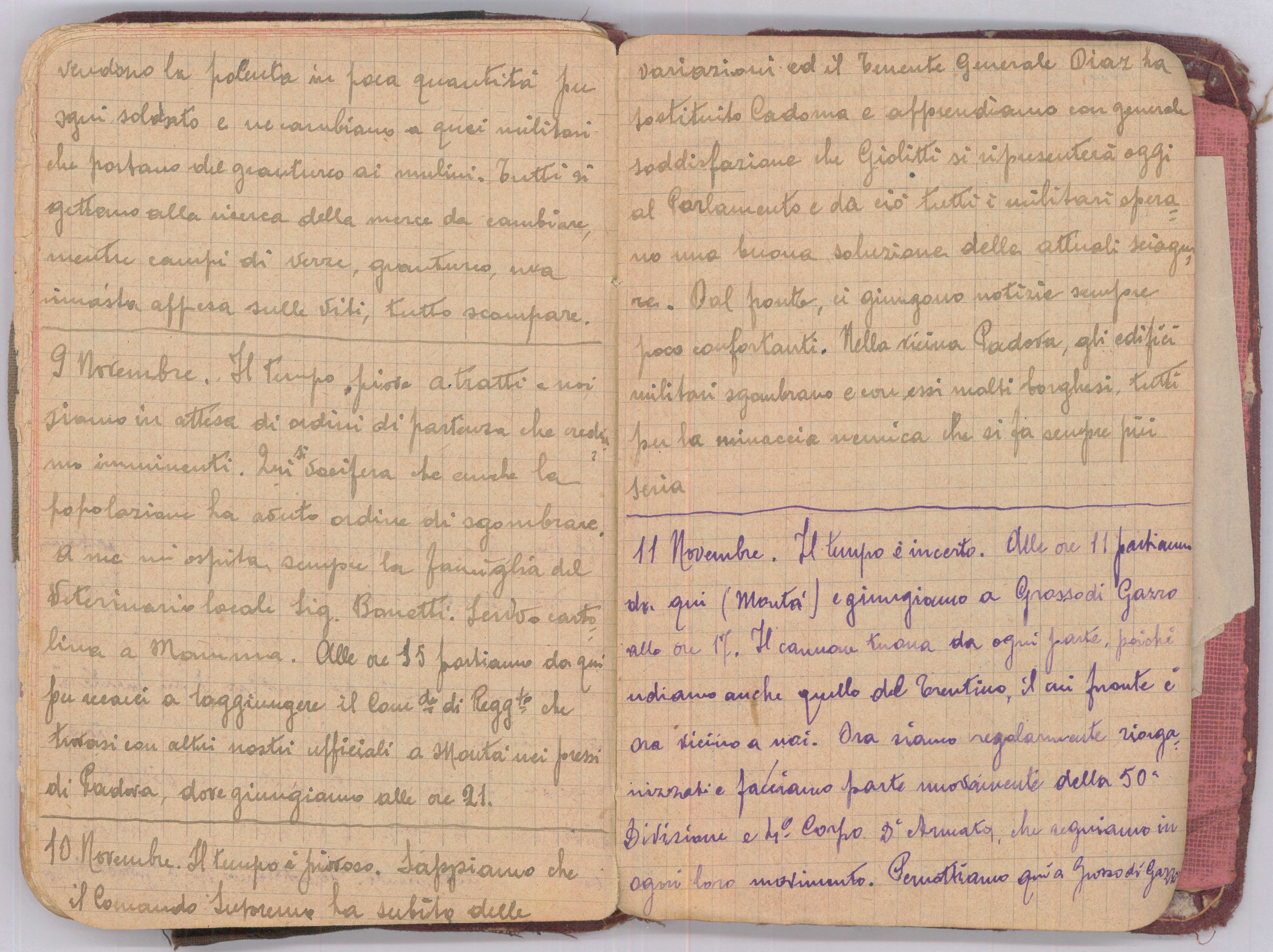 Il tempo è piovoso. Sappiamo che il Comando Supremo ha subito delle variazioni ed il tenente generale Diaz ha sostituito Cadorna e apprendiamo con generale soddisfazione che Giolitti si ripresenterà oggi al Parlamento e da ciò tutti i militari sperano una buona soluzione delle attuali sciagure. Dal fronte ci giungono notizie sempre poco confortanti. Nella vicina Padova, gli edifici militari sgombrano e con essi molti borghesi, tutti per la minaccia nemica che si fa sempre più seria.